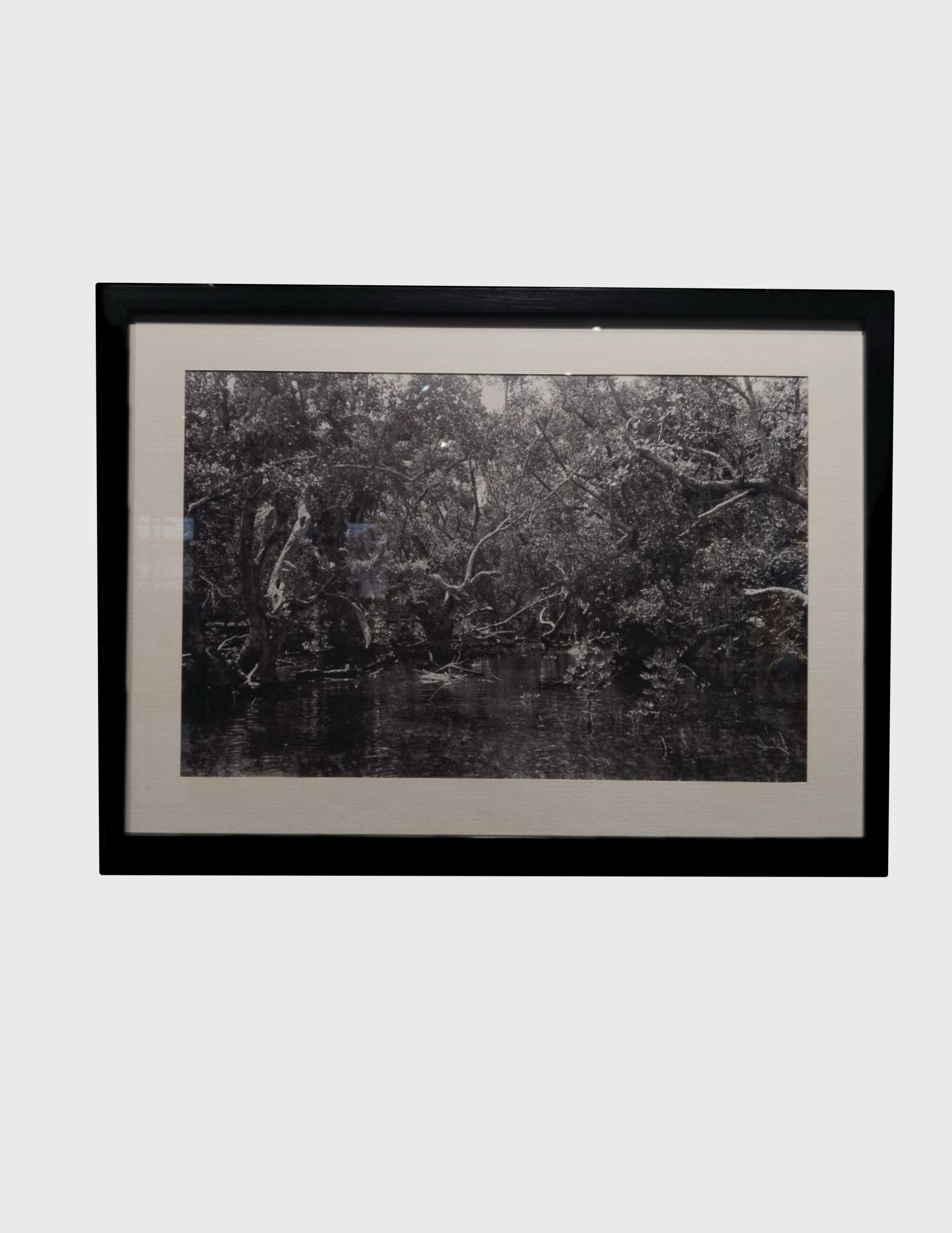 A photo of mangroves in Mahinog, Camiguin offering a raw and unfiltered glimpse into the dense and tangled beauty of the local foliage. The absence of color strips the scene to its elemental forms, emphasizing the intricate patterns and organic shapes. Left with only the texture and detail from the film used to take the photograph, the stark contrast between light and shadow draws the viewer's eye through the labyrinthine branches and the reflection of the trees in the still water, inviting exploration and contemplation.
