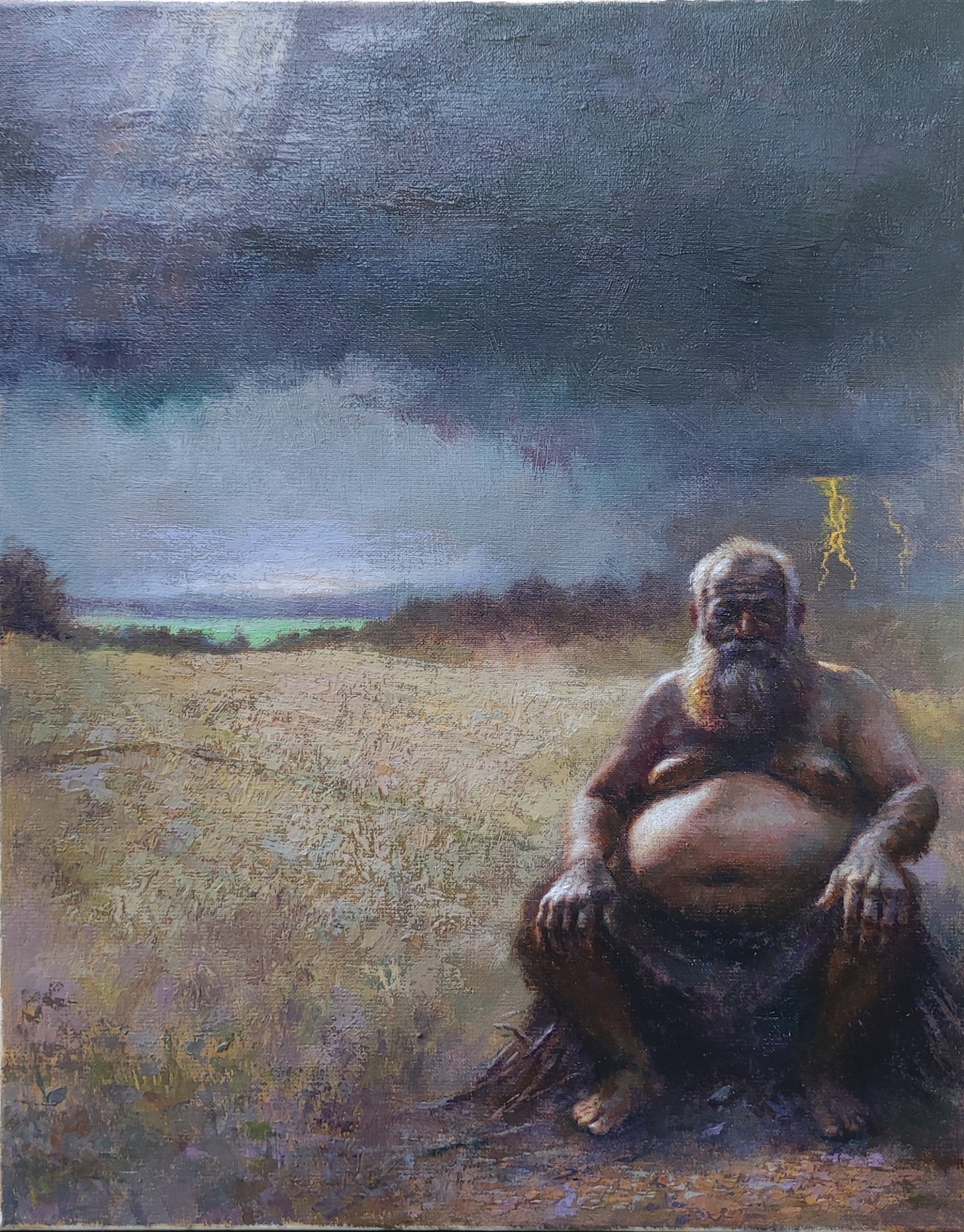 Chaos Theory is a mathematical concept that is rooted in the idea that even seemingly insignificant actions can have far-reaching effects, particularly in complex systems. It is also called the "Butterfly effect". It says that a flap of a butterfly wing from one side of the world can trigger an event that would lead to a hurricane that would flatten the other side of the world. In the painting an old farmer is unwittingly waiting the fate of the crop he is tending.In the background is a brewing storm.