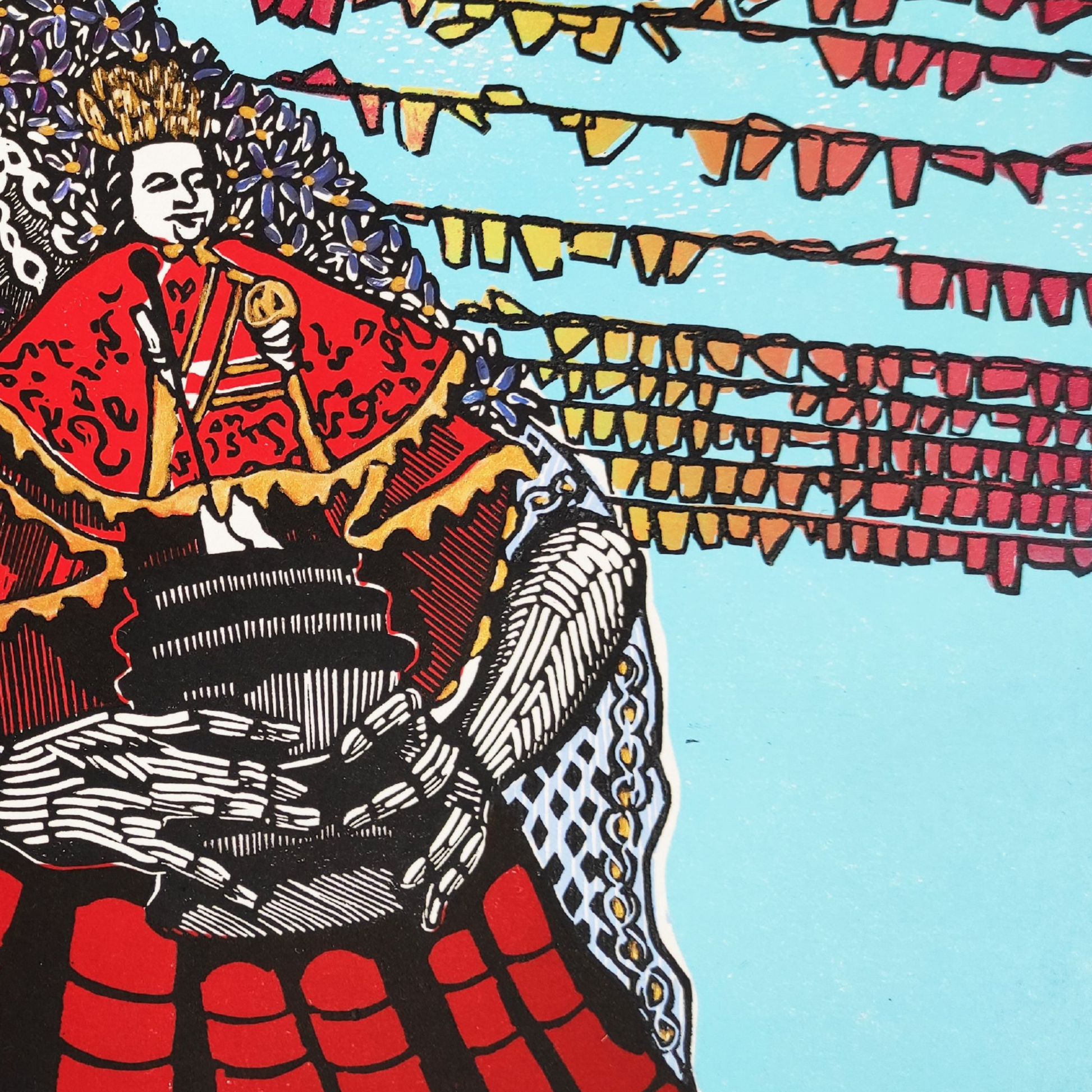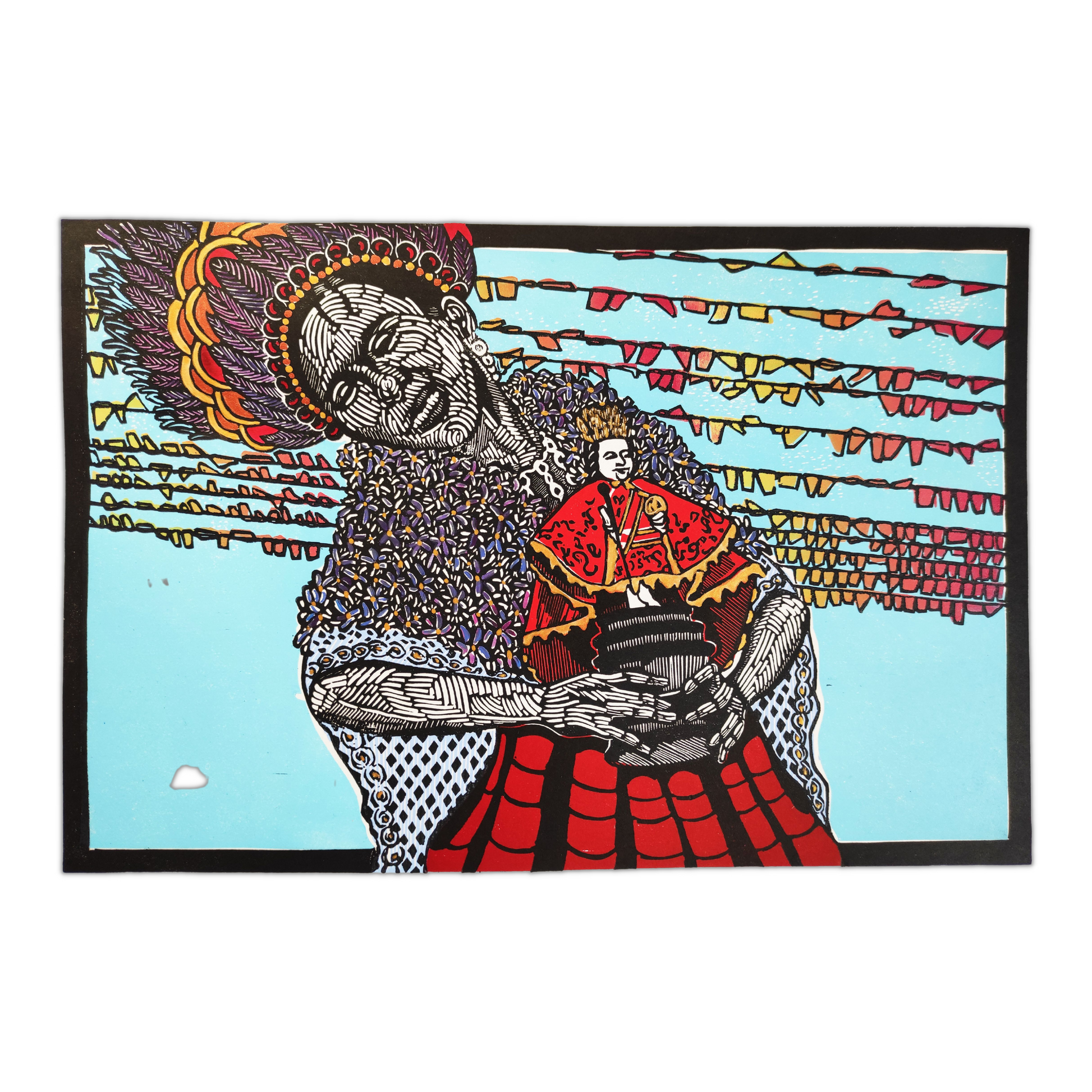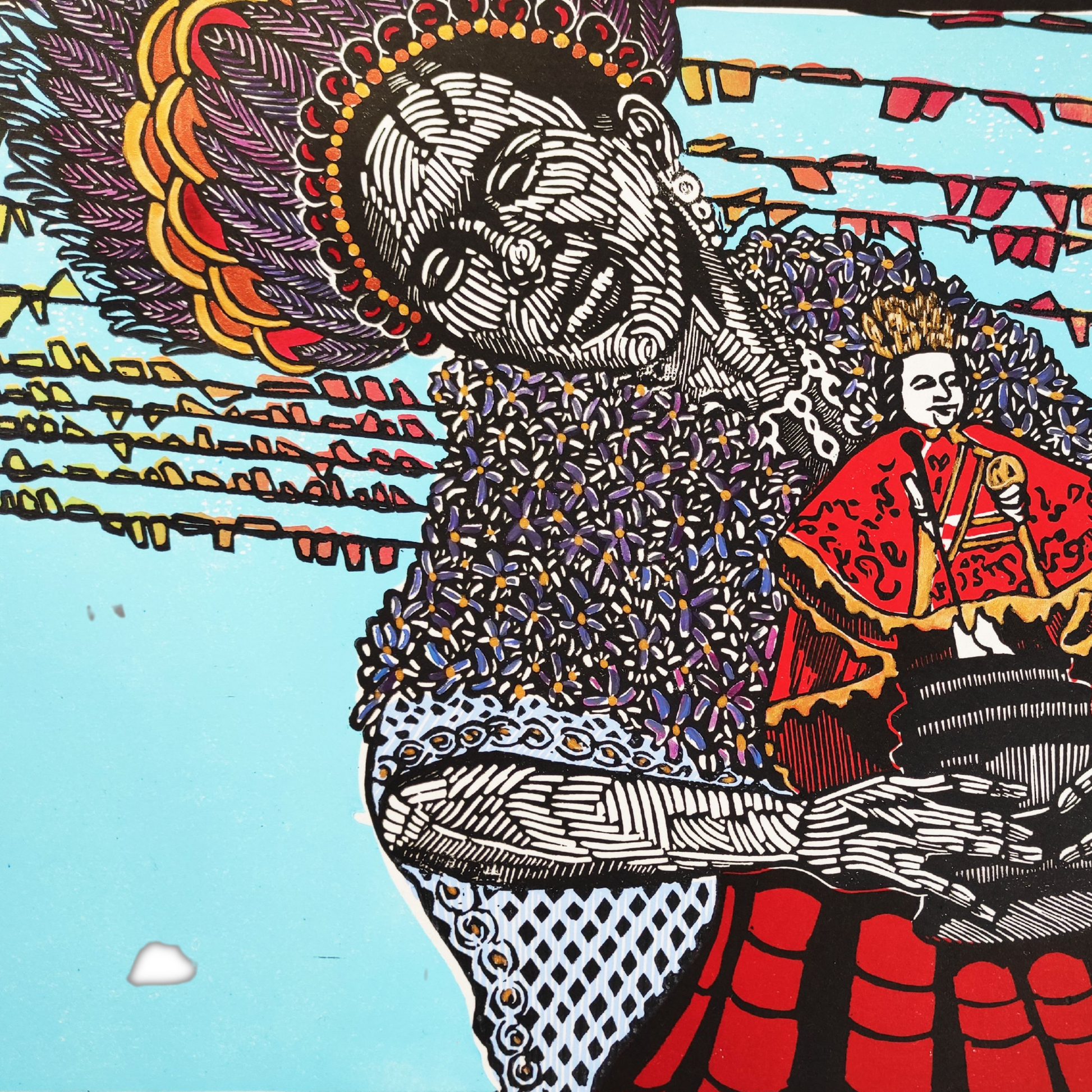 A three-block linocut print. This is a piece that explores intersections of women in celebration, ritual, and religion, as well as the gaze of the traveller/tourist vs an embodied personal gaze. As a third culture kid growing up in the UK, the history and origins of such tradition(s) is knowledge that often gets lost and left untranslated so this piece was a gateway into reclaiming a part of my heritage.