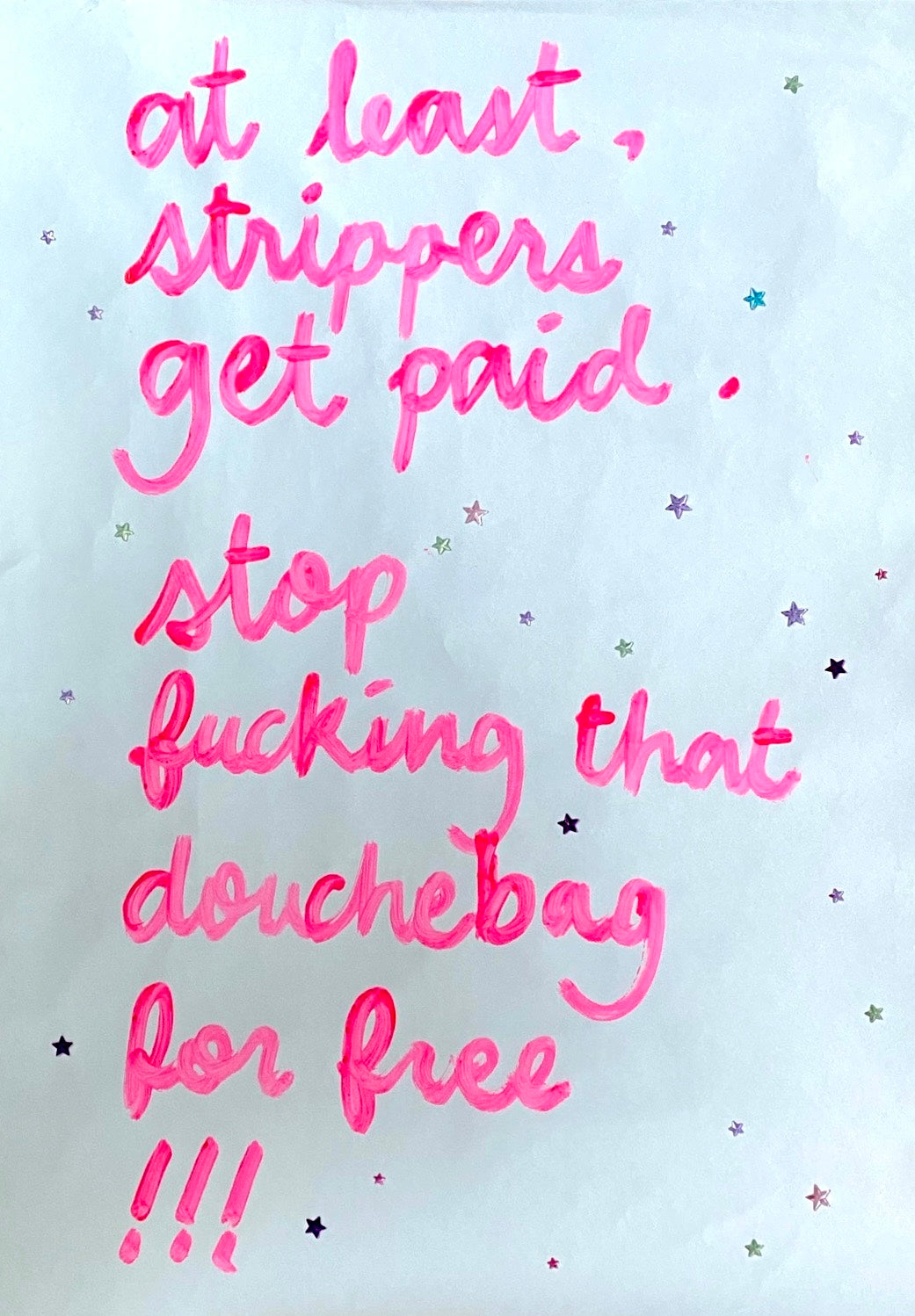 At least, strippers get paid. Stop fucking that douchebag for free! Done in acrylic and stickers on 120gsm Materica paper.