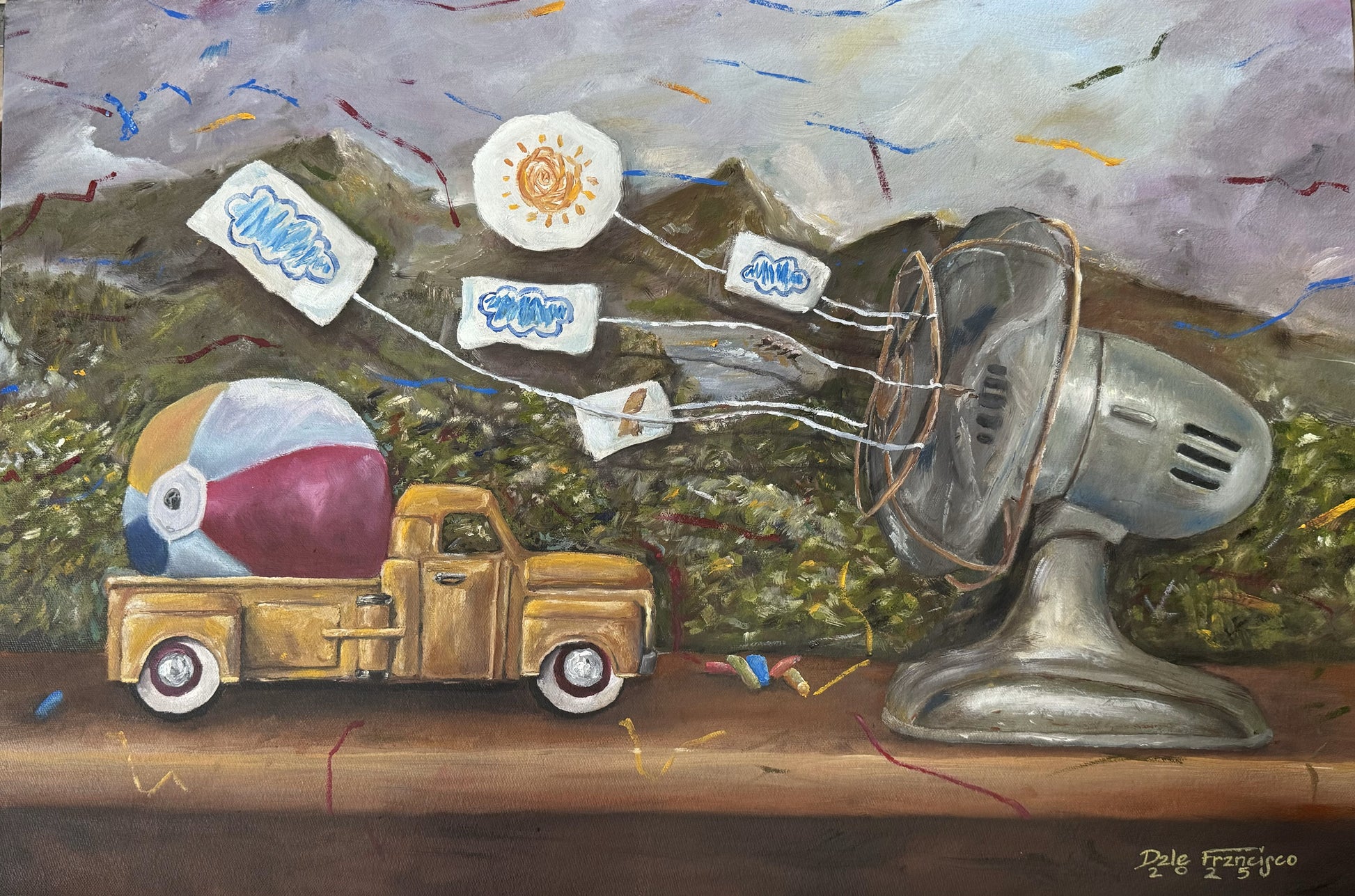 "Dream Vacation" shows a quiet but playful moment, a small truck carries a giant beach ball, while drawings of clouds, the sun, and a plane are being blown by a fan. These images feel light and joyful, like memories or daydreams.