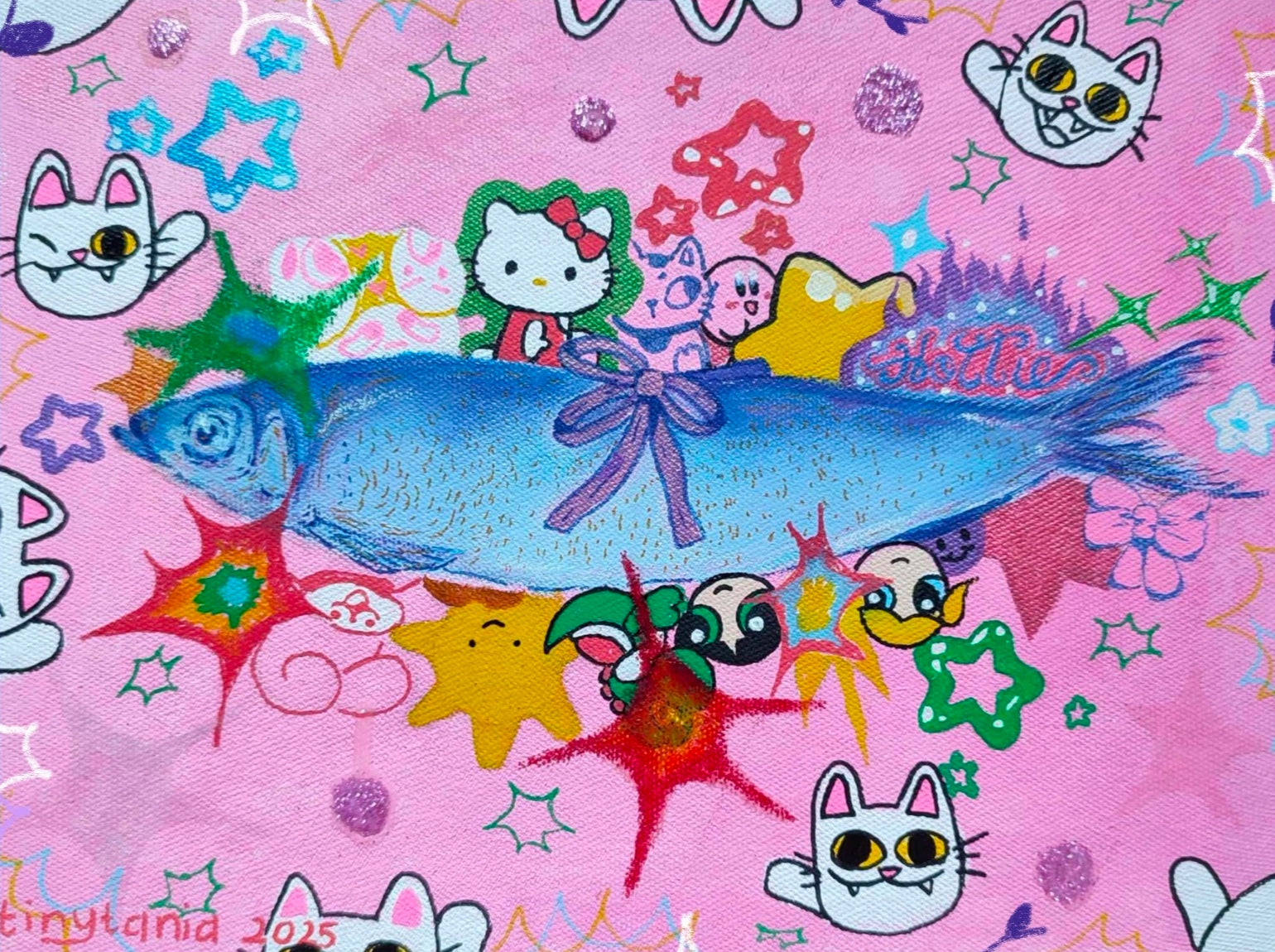The artists' take on incorporating things they like along with their identity. With the herring referring to their Dutch hometown. The different types of characters and silly little creatures reflecting the artists' love for colours and child-like things. And the overall mix of medias and the fun chaotic nature of it