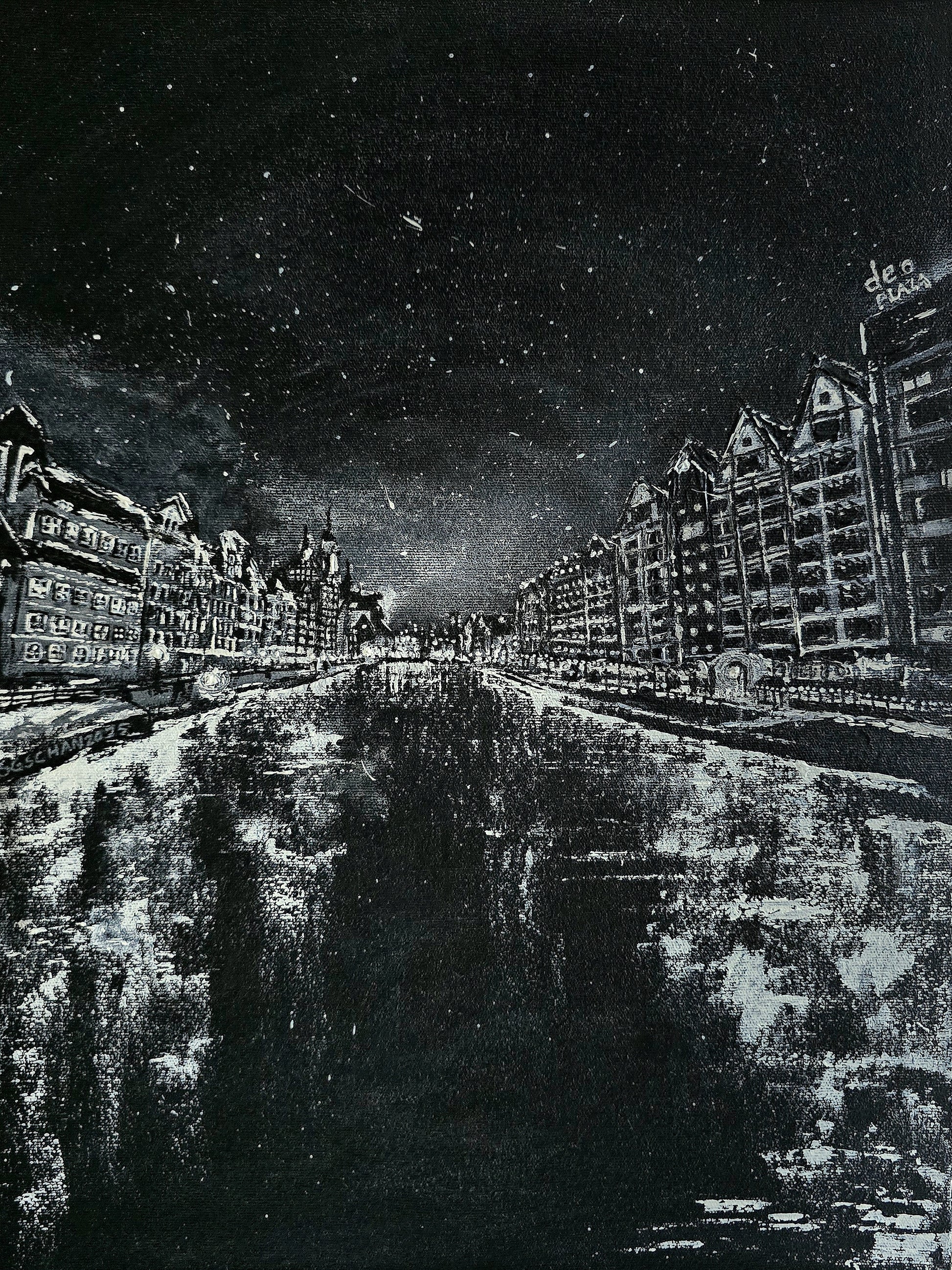 This is part of a 3-series painting of winter evenings in Poland entitled "Three Winters of the Soul". The paintings depict a stillness of a snowy Gdansk winter night in stark black and white, reflecting a profound sense of solitude. Despite the emotional isolation, the delicate contrast of light on snow-draped streets make it into something hauntingly beautiful, where loneliness and wonder exist.