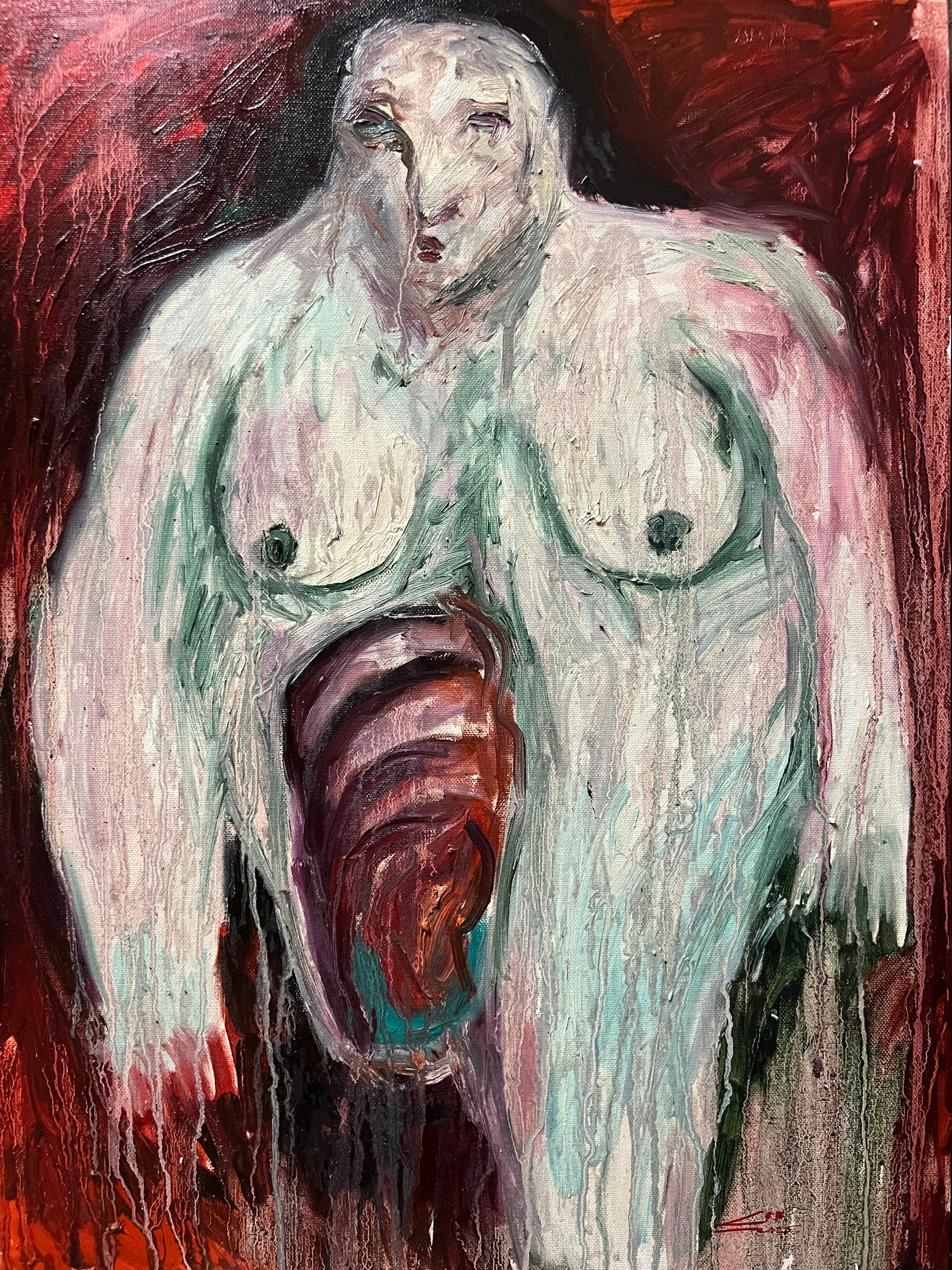 An 8-piece show composed of seven paintings and one sculpture. Billy Bagtas takes us into a raw and vulnerable existence in Thy Blood, where suffering is not concealed but rather known with great care and even reverence. Bagtas uses distortion, color, and gesture to create stories that are very human while confronting the body and spirit in its most shattered but honest states throughout these pieces. His paintings include deformed, ghostlike figures oozing through layers of crimson, black, and white, hinting at hardship, a sense of belonging, and perhaps relief. The names Timothy, Daniel, Thomas, Christian, Gabriela, and Eve ground the art in something personally distinct, as if each piece has an identity.