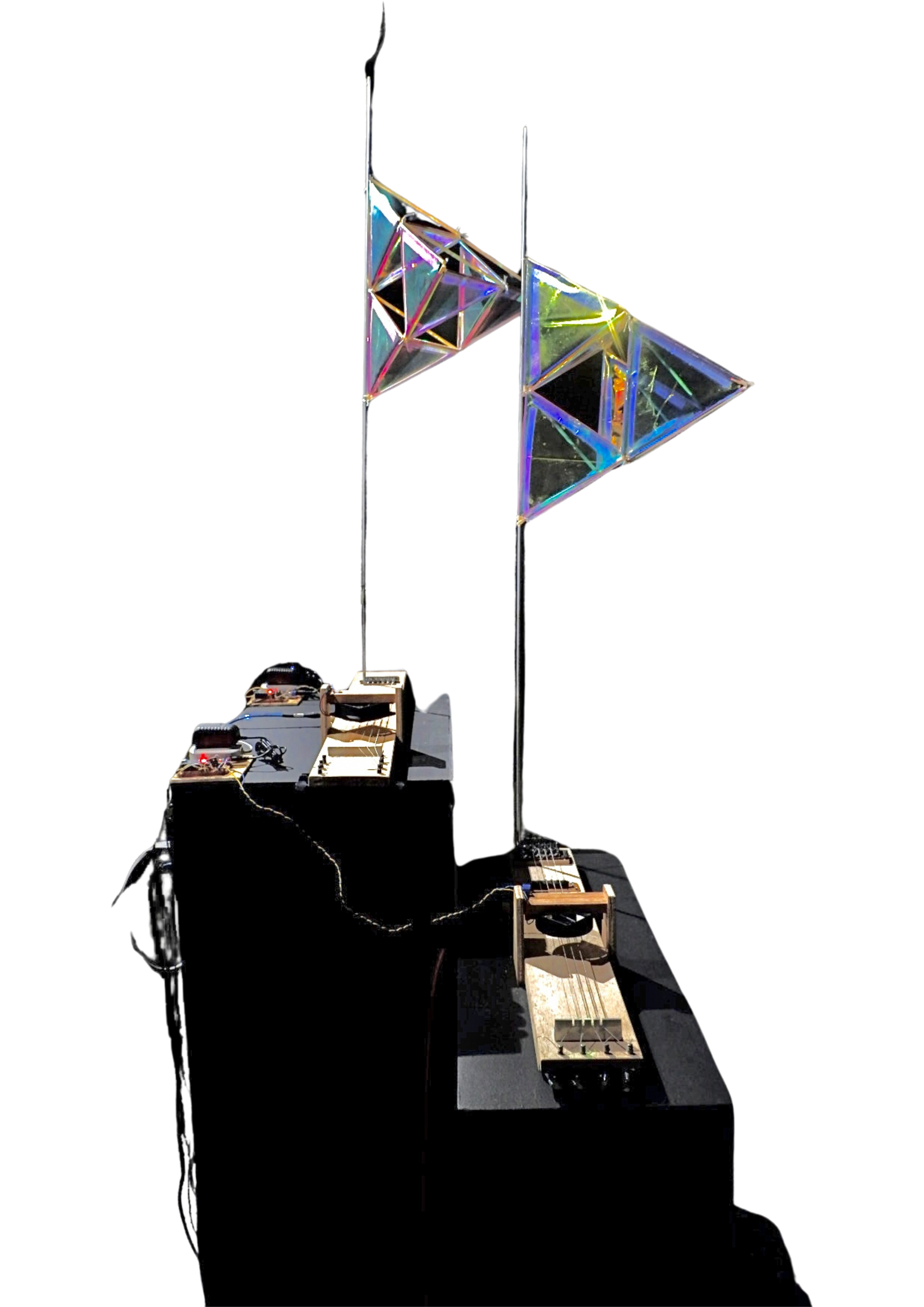 wood, metal, guitar accessories, magnets, arduino, straw, film with attached kite. (Does not include amplifiers)