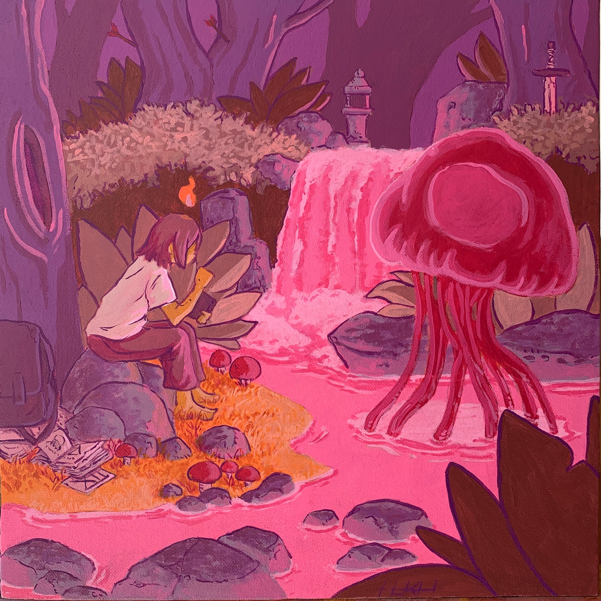 In this piece, the student is caught in a trance, observing a rare jellyfish that slowly transforms into a luminous vessel—a living archive of memories drifting through time. Its translucent tendrils glow softly, each pulse revealing fragments of stories, lessons, and moments preserved beyond mortality. Here, memory is transferred delicately to the student: fluid like water, resilient like light.