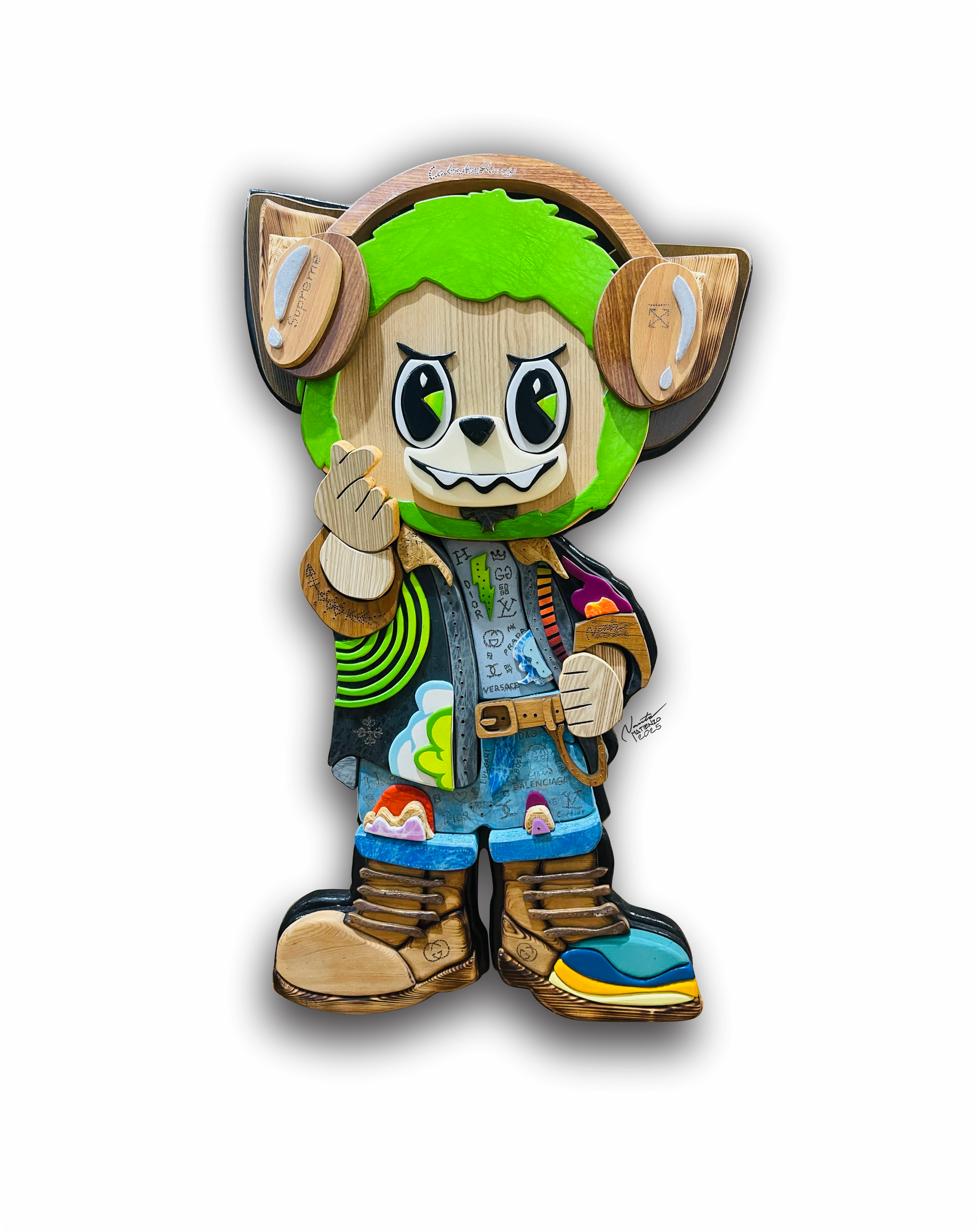 Labubuknoy is a wall-bound layered wood sculpture that merges my original lowbrow character Buknoy with the playful pop figure Labubu. This fusion creates a bold and quirky persona that reflects both underground culture and commercial appeal. Embedded with luxury brand logos, the piece contrasts humble origins with symbols of status, exploring themes of identity, aspiration, and the allure of a luxurious lifestyle.