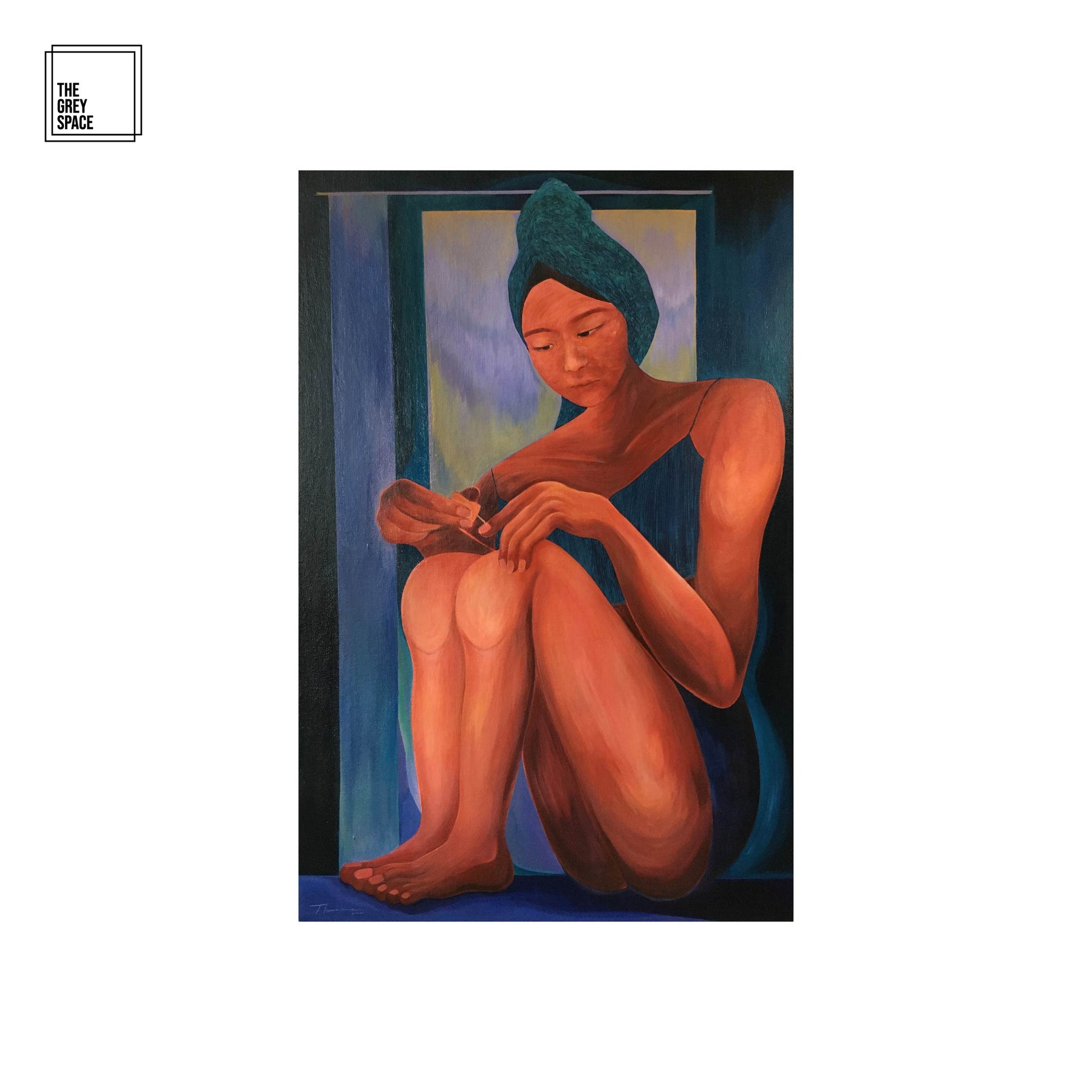 "An image of a woman painting her nails as the landscape behind her basks in colors of another day ending. With a towel on her head, she appears to have only gotten out of the shower. Today, we can say, that she made an effort. Does it matter who these rituals are for? ""Making an Effort"", is a piece on celebrating wins. Wins such as waking up, bracing the day, and taking a shower. Mundane and daily tasks that may be easy for some, could be difficult to do for others. It matters greatly to take time to take care of yourself, to reaffirm the things we can and cannot control; and to make the simplest effort to get out of the loophole - which can be done by painting your nails, even if no one sees them."