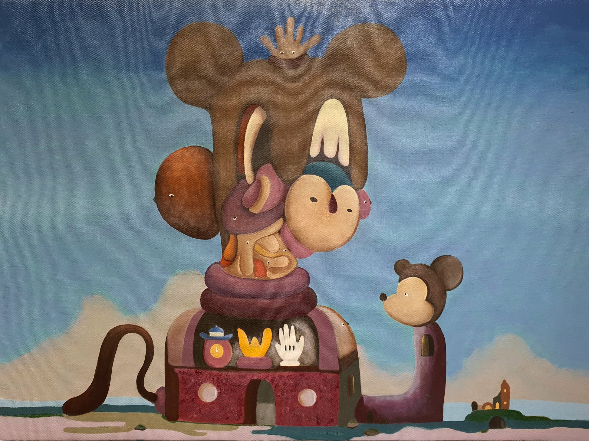 The artwork is inspired by the theme of Mickey Mouse as you look at the artwork, there are a few objects that remind us who created it, what makes Mickey Mouse known, and interaction that creates a feeling of childhood and reminiscing that moment