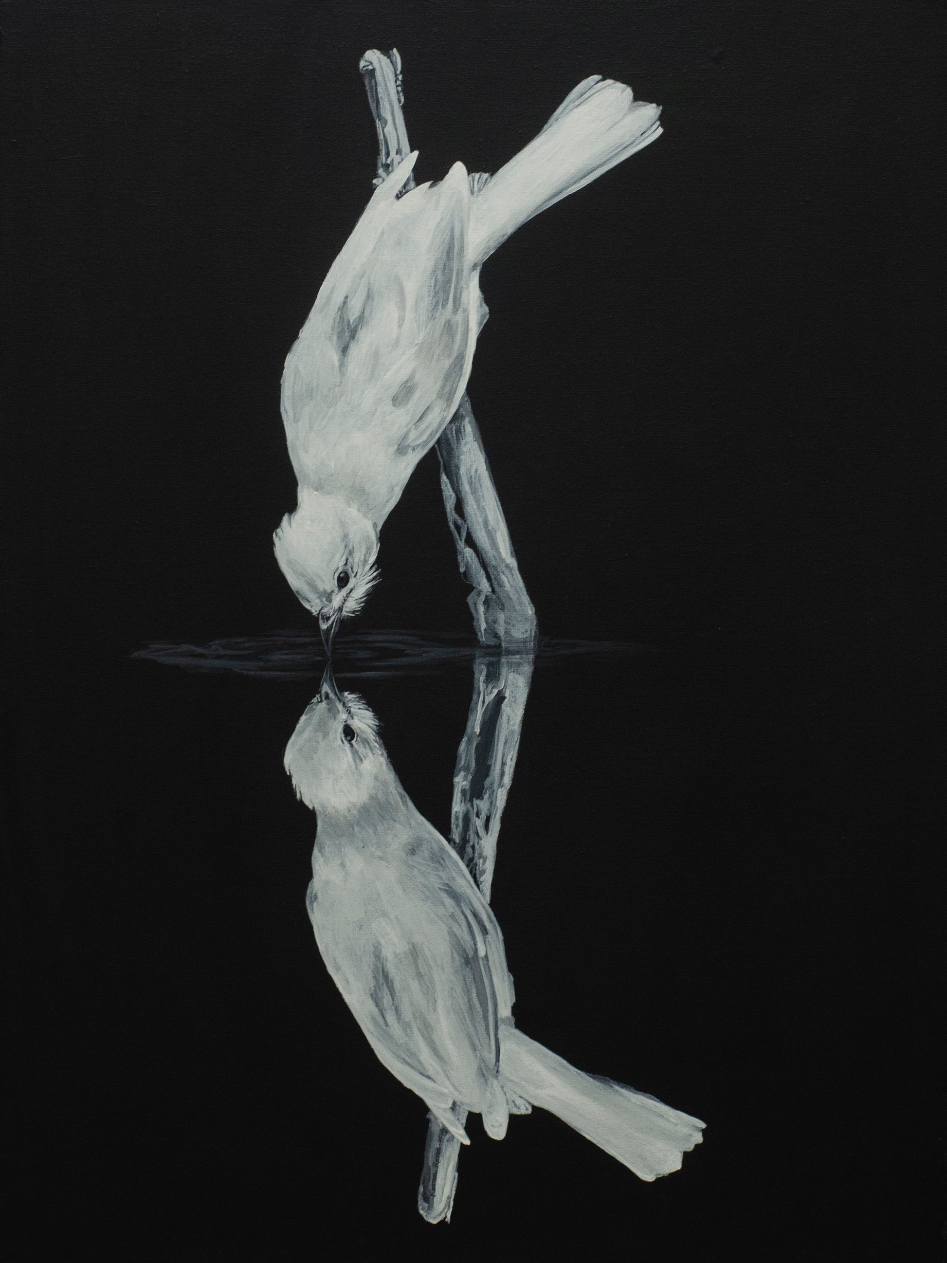 Depiction of a leucistic yellow-vented bulbul as part of the Ghost series of paintings.