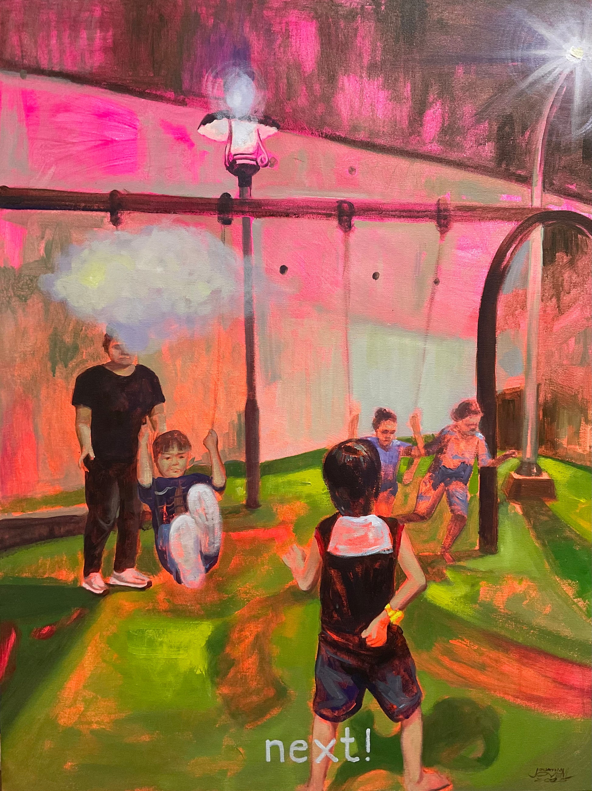 A lively scene unfolds as children delight in the park, fully embracing the joy of play. In the background, a group of enthusiastic kids eagerly takes turns on the swing, their laughter and excitement echoing through the air as they make the most of their time in this vibrant playground.