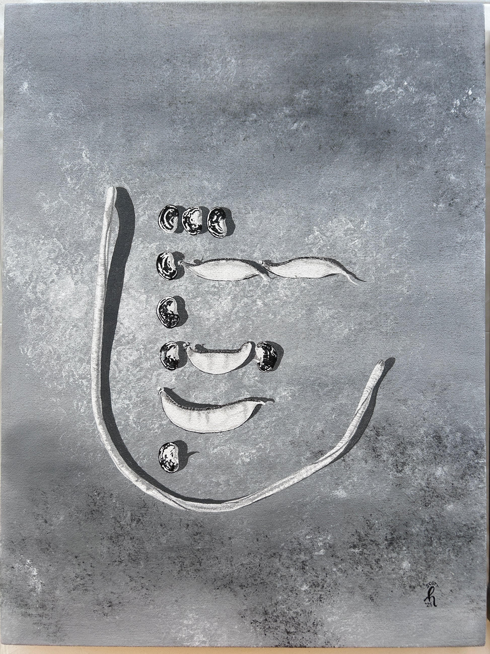 “Sitao, batao, patani” is inspired by the beloved “Bahay Kubo” nursery rhyme, this artwork spotlights three beans. The painting carries a secret message woven into its details; to decipher it is to claim a hidden wish, a symbolic gift from the artist to the viewer. In celebrating these humble plants, the piece delights in the idea that ordinary things can hold extraordinary surprises.