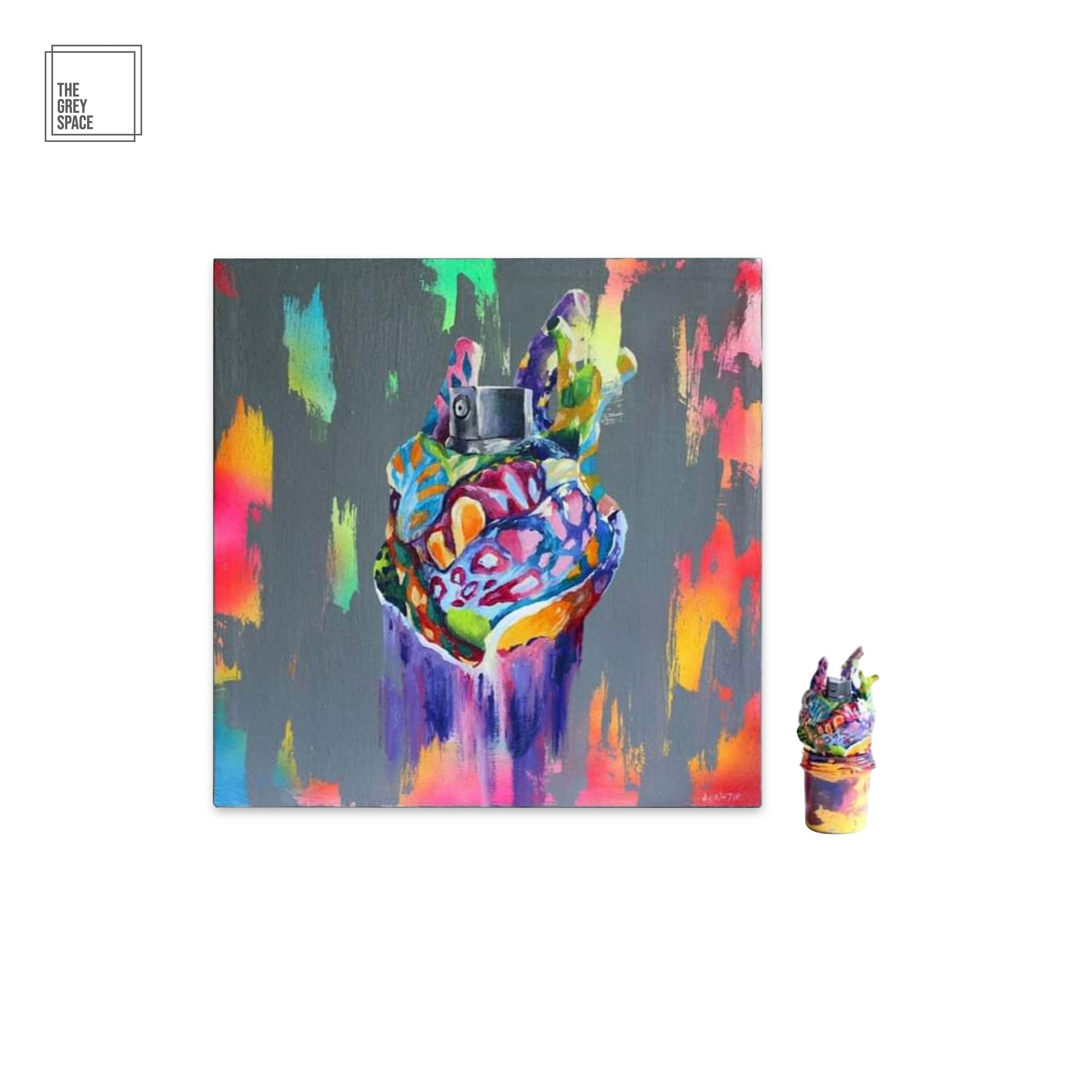 Part of the art heart series (paintings with sculpture )of the artist. This piece makes use of upcycled materials as part of the art process of the artist in his artmaking.