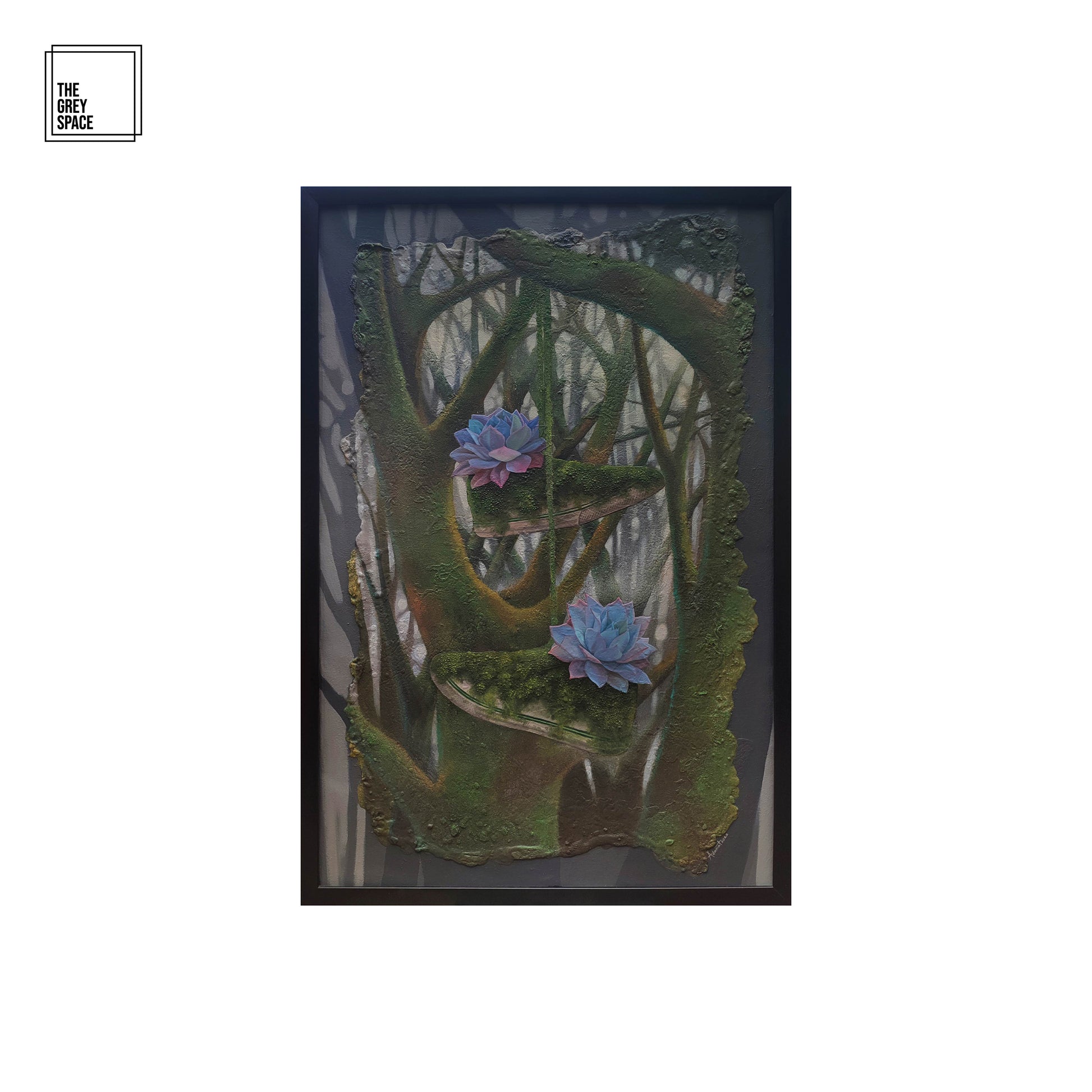"This painting is an attempt to capture the play of thoughts on how I'm still hanging on the thin lining of my reason against my own madness brought by the sudden change of the world around me, of my lost comfort zones, the shift of every plan and all uncertainties that's happening that my mind couldn't gasp. It tries to mirror my realization that while my physical body's bounded, the artist in me grew a triving crown of succulent on my shoe, that represents my life's journey. It's a realization that I was always free through art that saved me not just from the virus but from insanity, because I could create even in my stillnes and everything else will follow. - Jie Adamat"