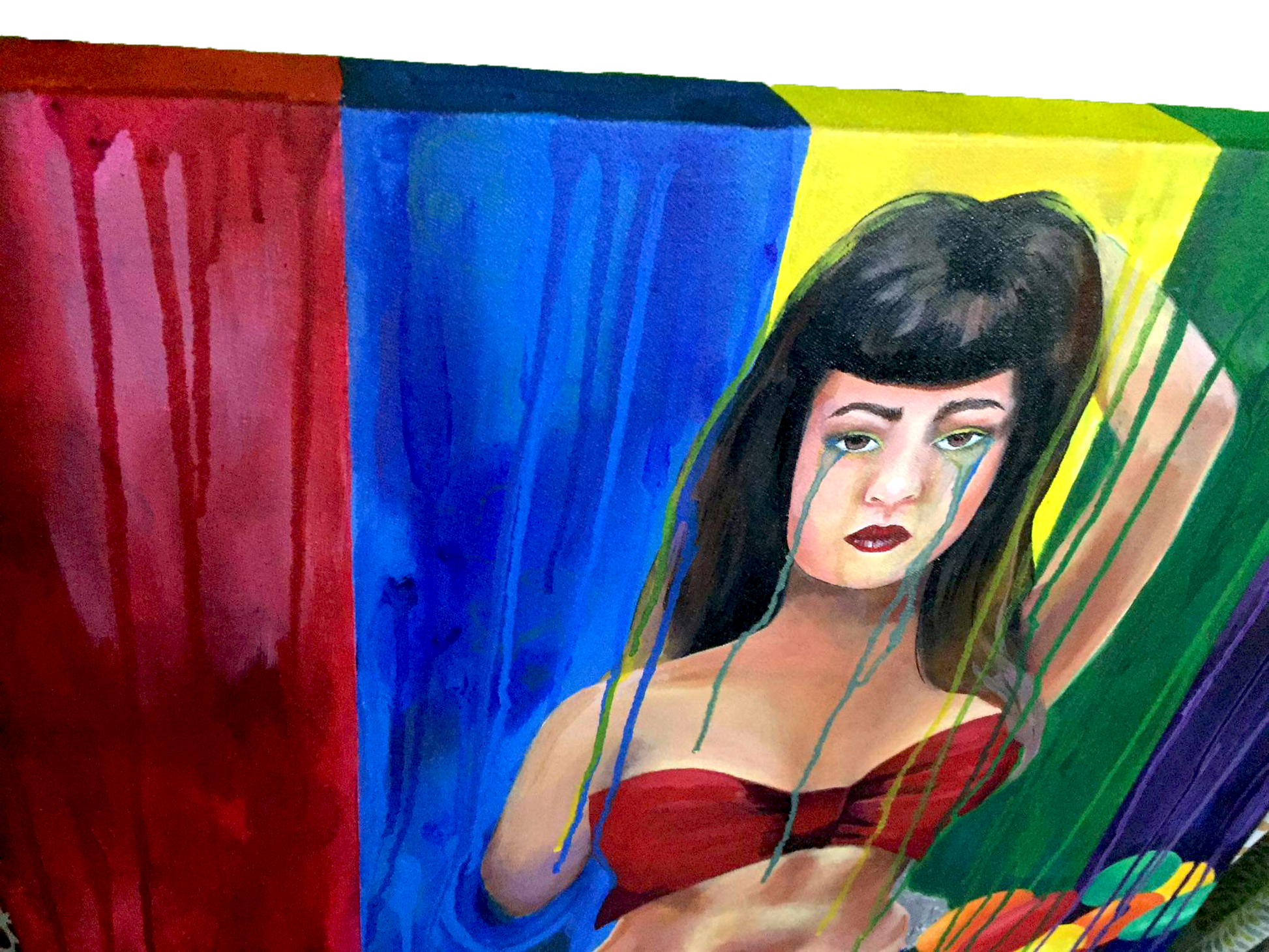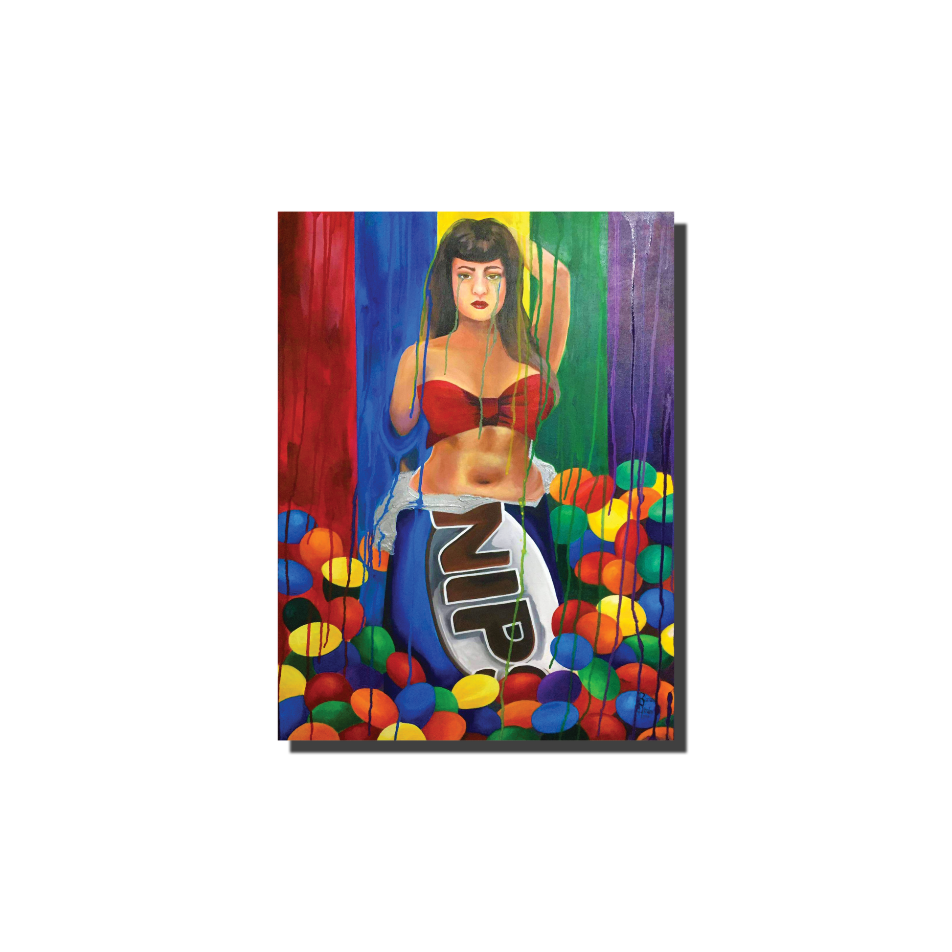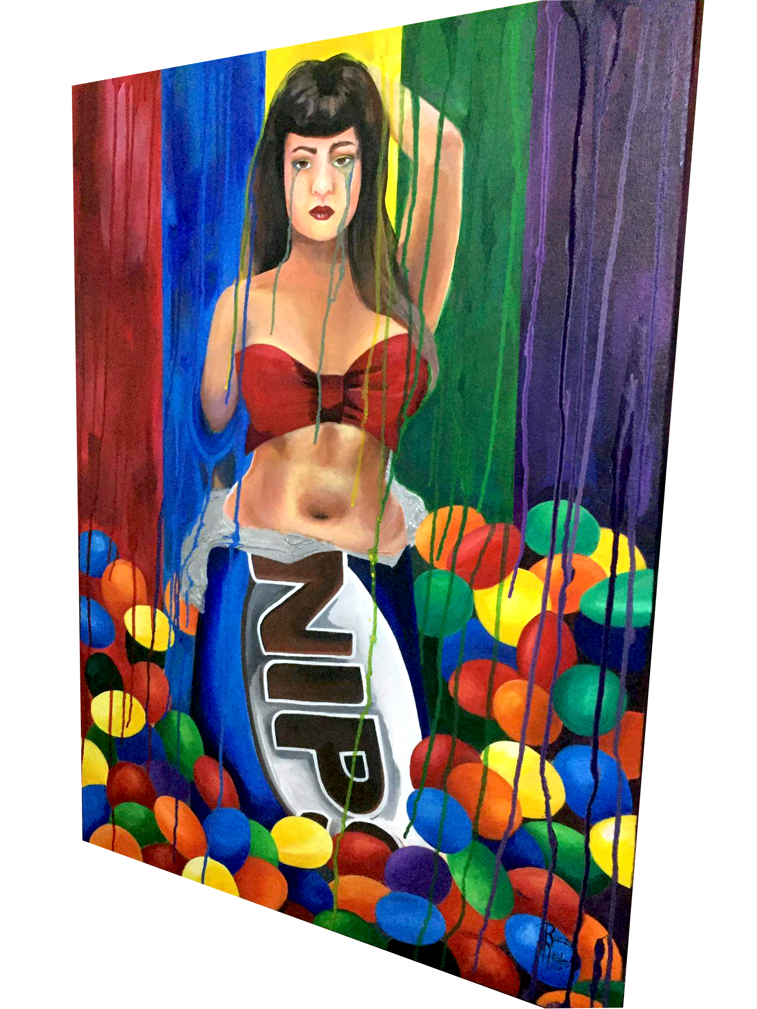 This painting is eye catching, vivid, exaggerated joy of sweetness. A local favorite treat we grew upon. As much happiness I placed on this canvas, I actually felt the opposite when creating this. 1 My mother worked overseas since i was 4 years old until i turned 16, She always brings home foreign chocolates every time she comes home, box loads of them. That's the only chance I get to taste and eat them, because we could not afford to buy it way back. My mom came home for good, after being away from me in 14 years. She settled and worked closer to me so she could watch me grow as a young woman. One time she bought me a pack of local chocolates, and said that she is sorry that it wasn't the one that I wanted, the expensive kind, she promised me we will have these things when we travel together someday. I took the chocolates and chug it into my mouth happily and told her that this is my new favorite. Now that she is gone, I want to express happy thoughts and memories. I eat these when I'm celebrating or creating and even when I'm in deep sorrow. WIe all have that comfort food, and this is mine. Not all candies are sweet on the inside. Some has a dark gloomy center.