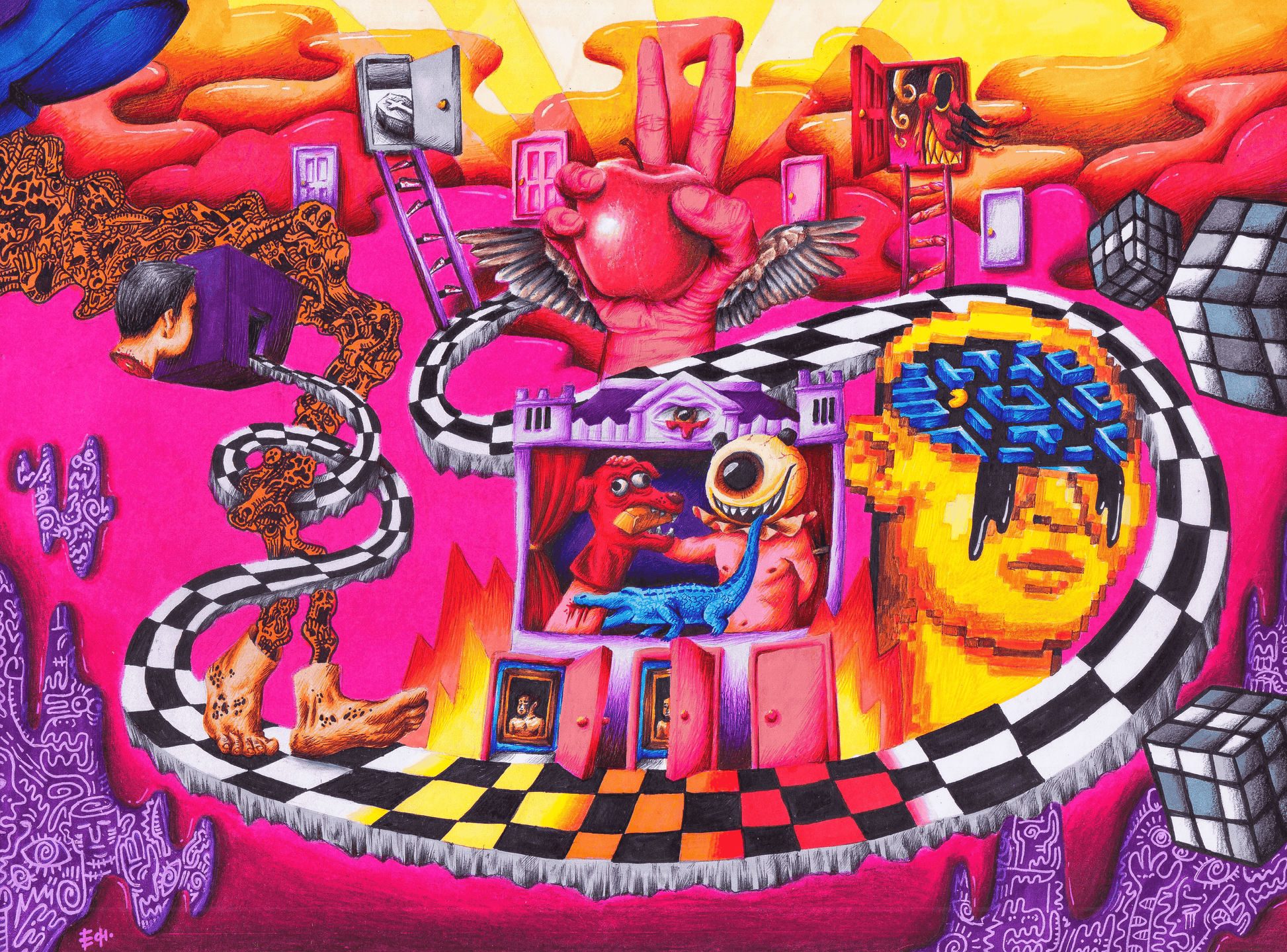 Markers, Colored Pencils, and Ink on Board (Framed)