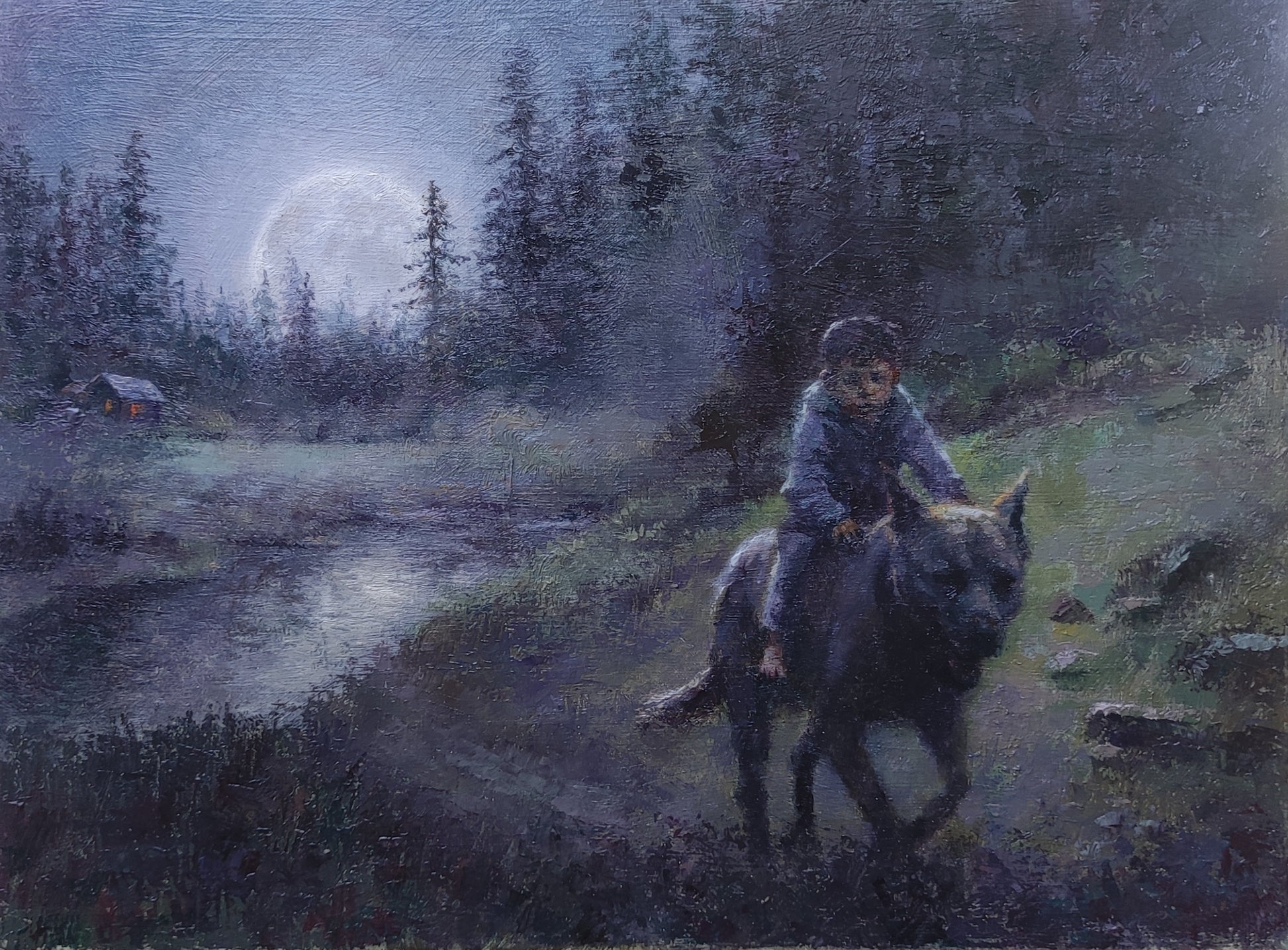 The painting is about a boy who is running away from his house in the middle of the night to go to an adventure riding a big dog (like the movie The Neverending Story).