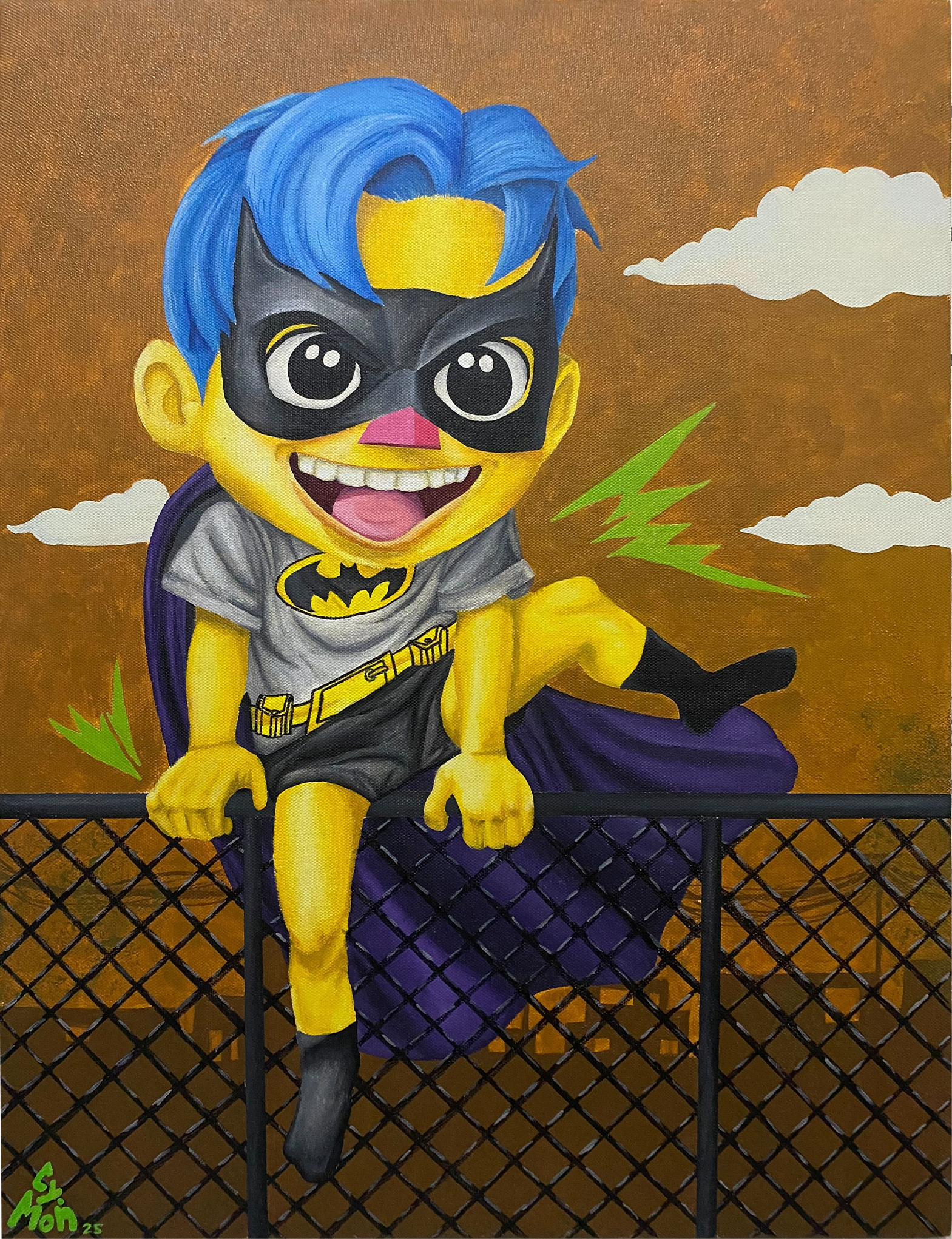 Wearing a costume store cape over house clothes, this child climbs—not out of play, but out of something deeper. The fence isn’t just a backyard obstacle; it’s the line between the safety of childhood and the tough world waiting beyond.