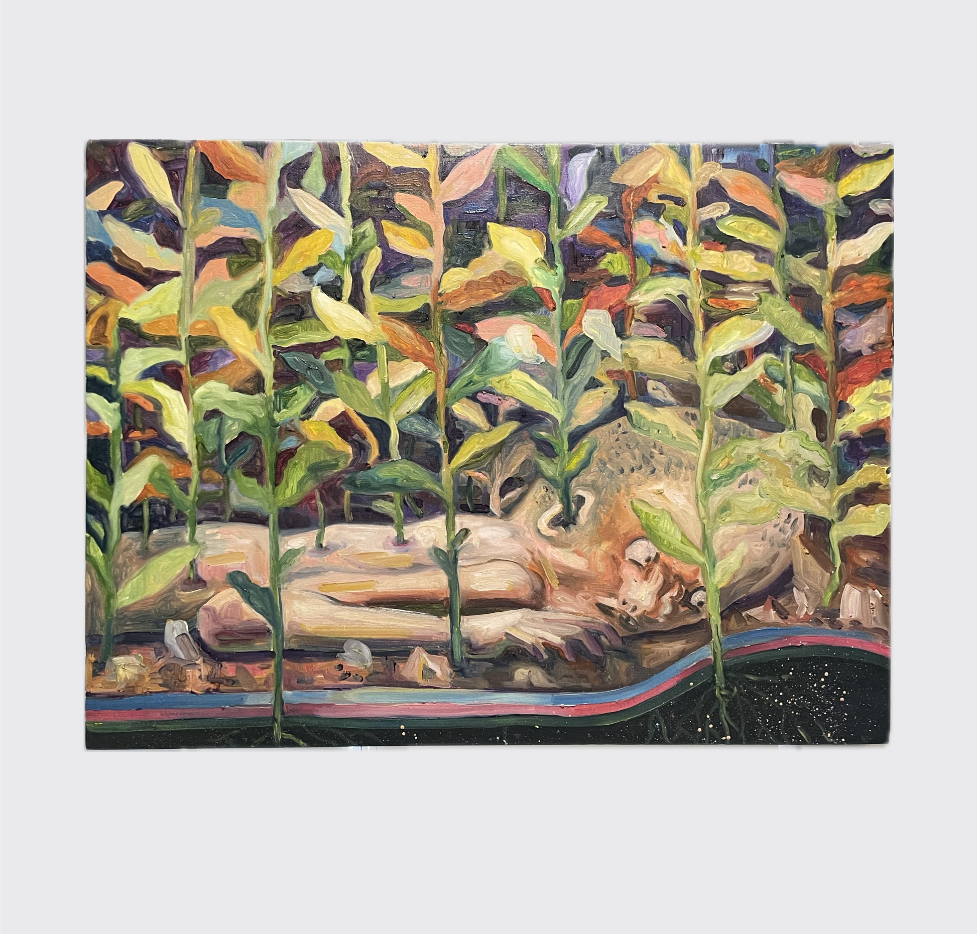 This painting appears to depict a surreal or abstract scene where plant stalks, possibly corn or similar vegetation, grow over what seems to be a partially buried figure or object. The plants are painted in vivid, somewhat unnatural colors, with a mix of yellows, greens, and purples. The figure beneath the plants is somewhat obscured, blending into the earthy tones of the ground, creating a sense of integration with the environment.