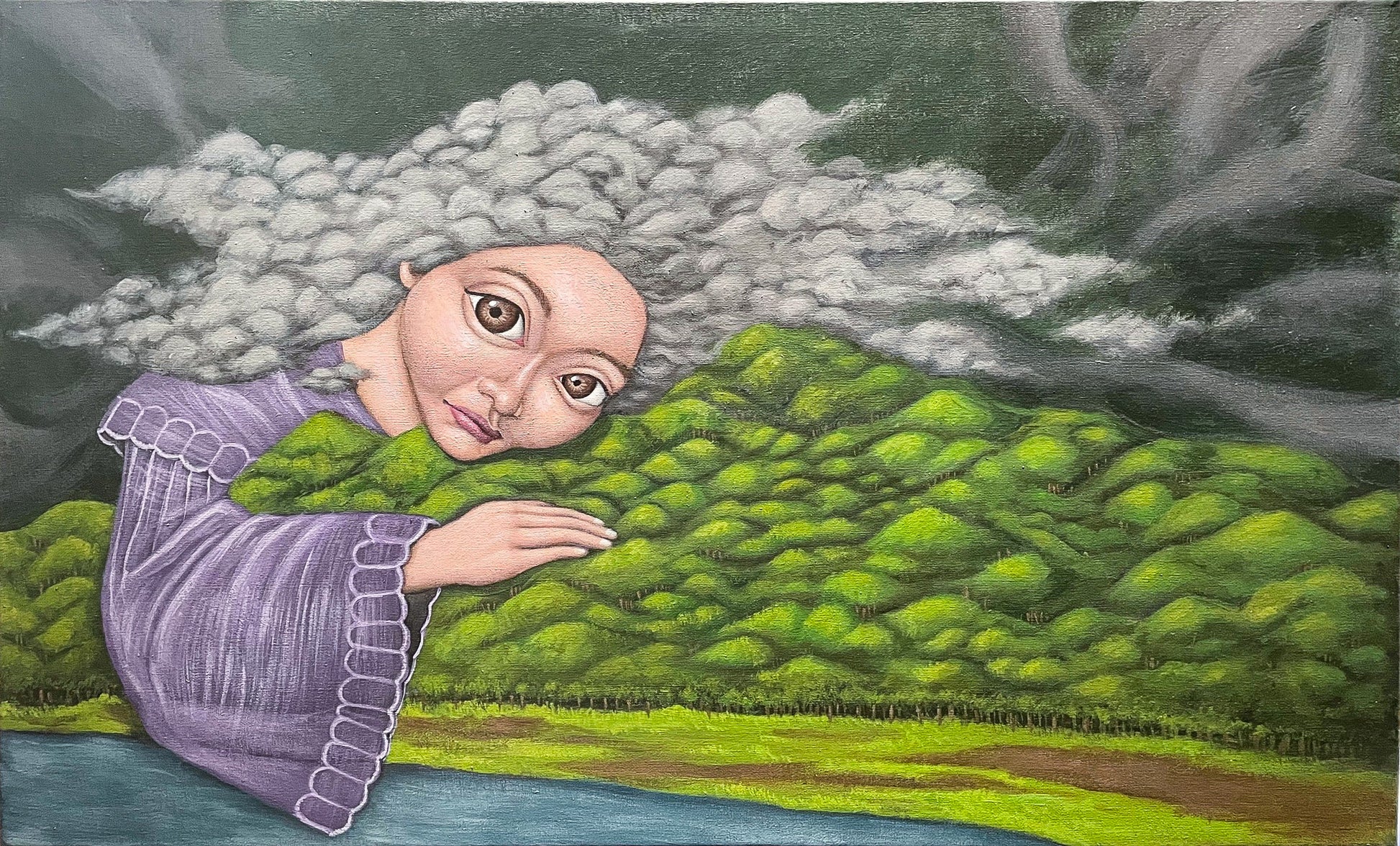 The persistent feeling of sadness overtakes our lone character. It is shown through her hair that flows like a gray cloud. Embracing her own nature, shown as the mountain of doubts and fears. She looks at the viewer with an expression of misery.