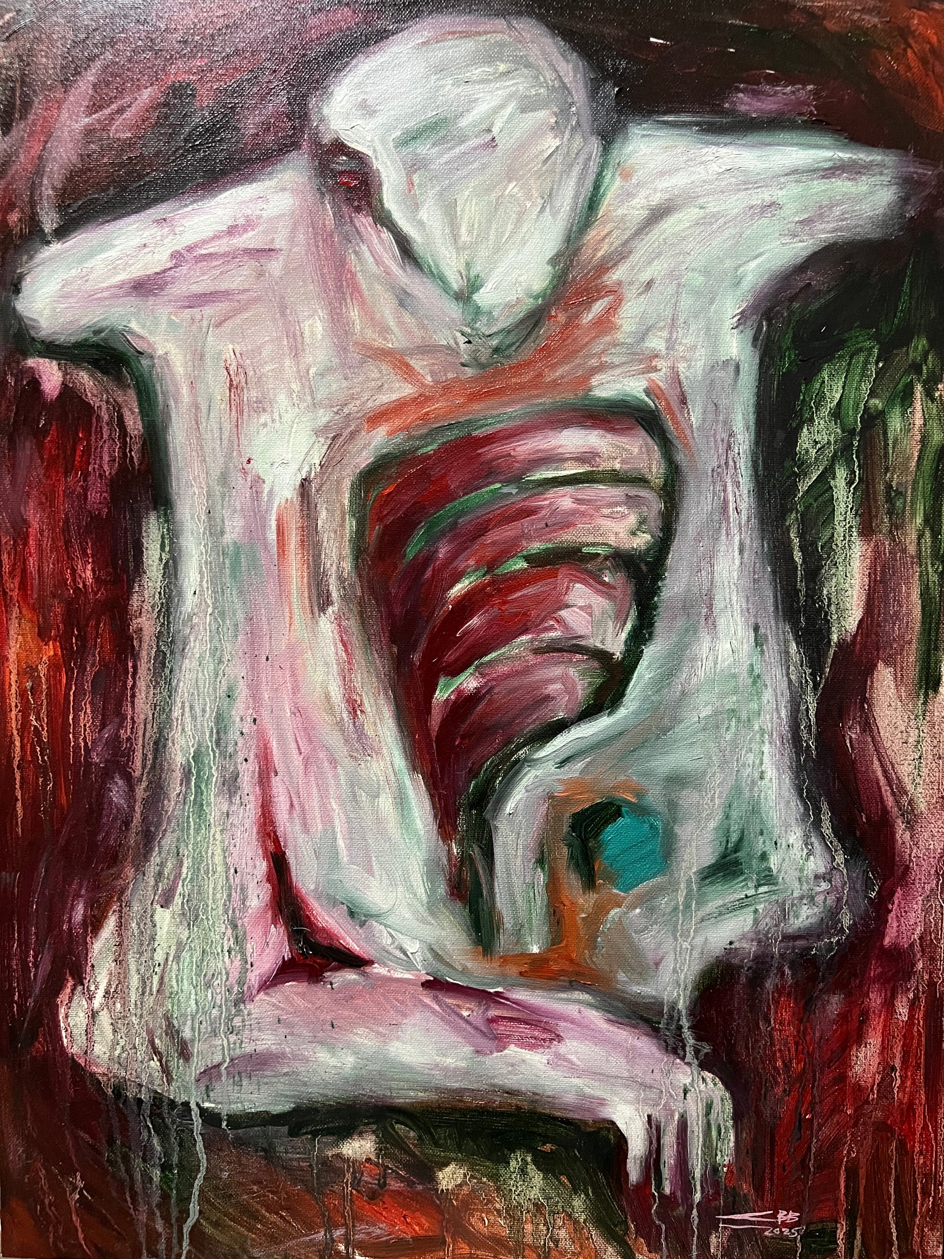 An 8-piece show composed of seven paintings and one sculpture. Billy Bagtas takes us into a raw and vulnerable existence in Thy Blood, where suffering is not concealed but rather known with great care and even reverence. Bagtas uses distortion, color, and gesture to create stories that are very human while confronting the body and spirit in its most shattered but honest states throughout these pieces. His paintings include deformed, ghostlike figures oozing through layers of crimson, black, and white, hinting at hardship, a sense of belonging, and perhaps relief. The names Timothy, Daniel, Thomas, Christian, Gabriela, and Eve ground the art in something personally distinct, as if each piece has an identity.