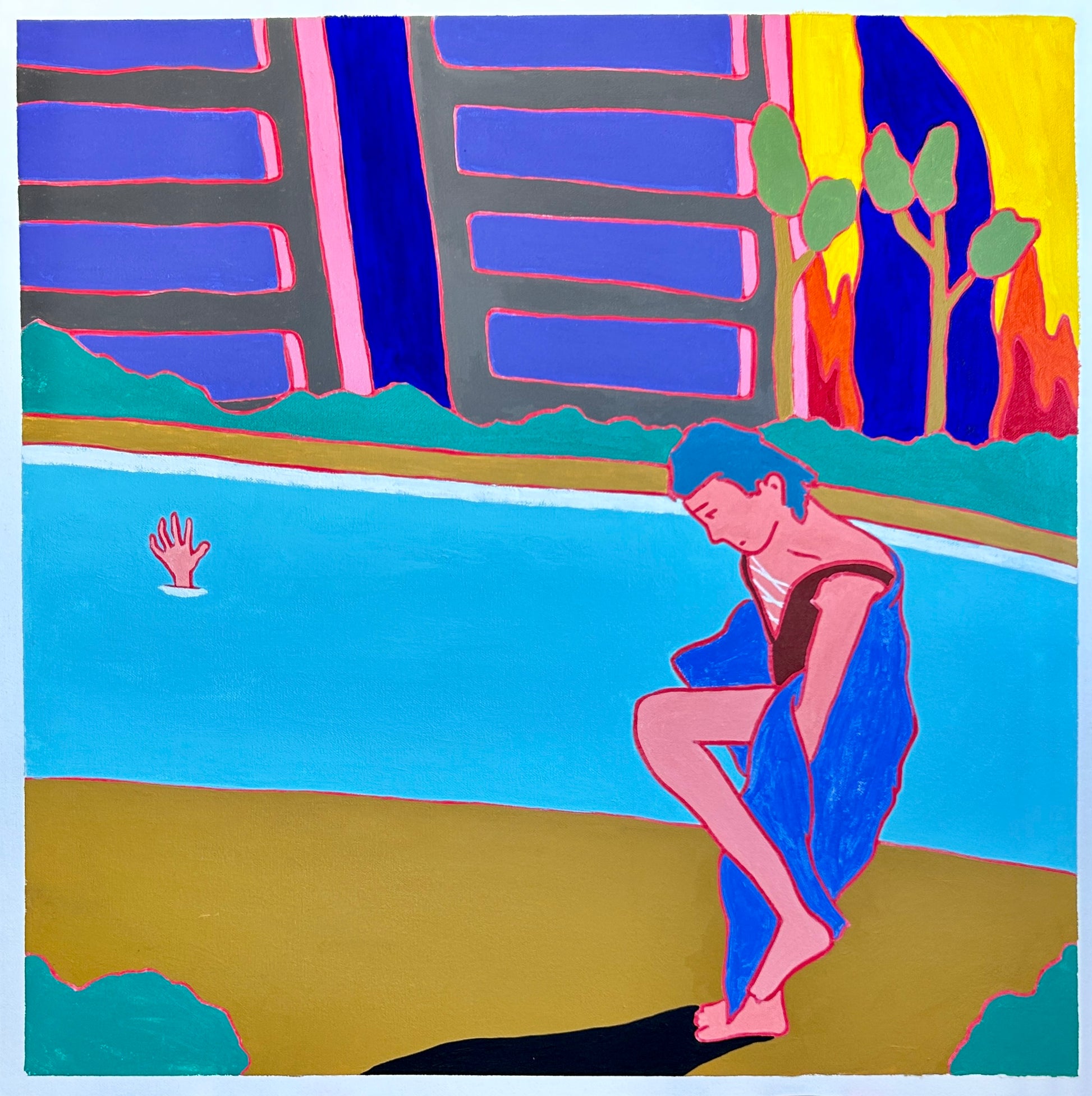 A person gets out of a pool. One is left behind. There seems to be an emergency but both are unaware of what's happening outside.