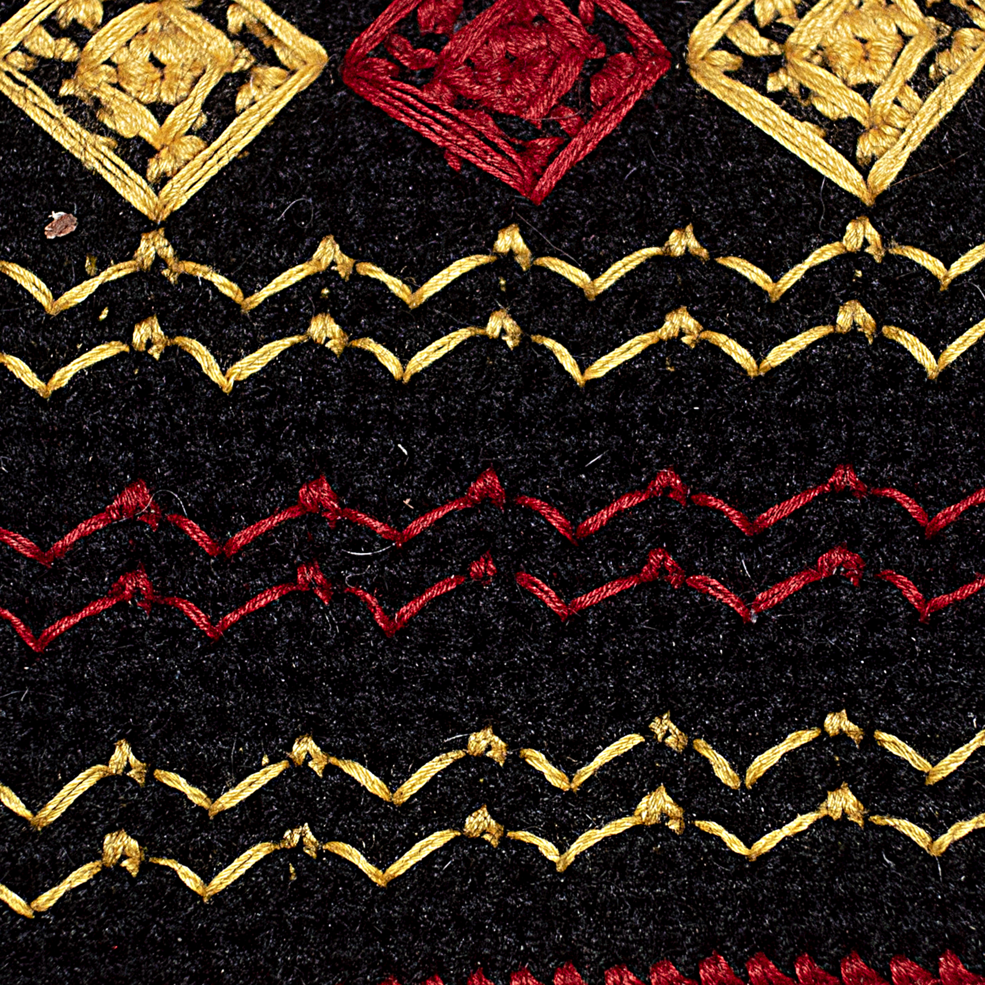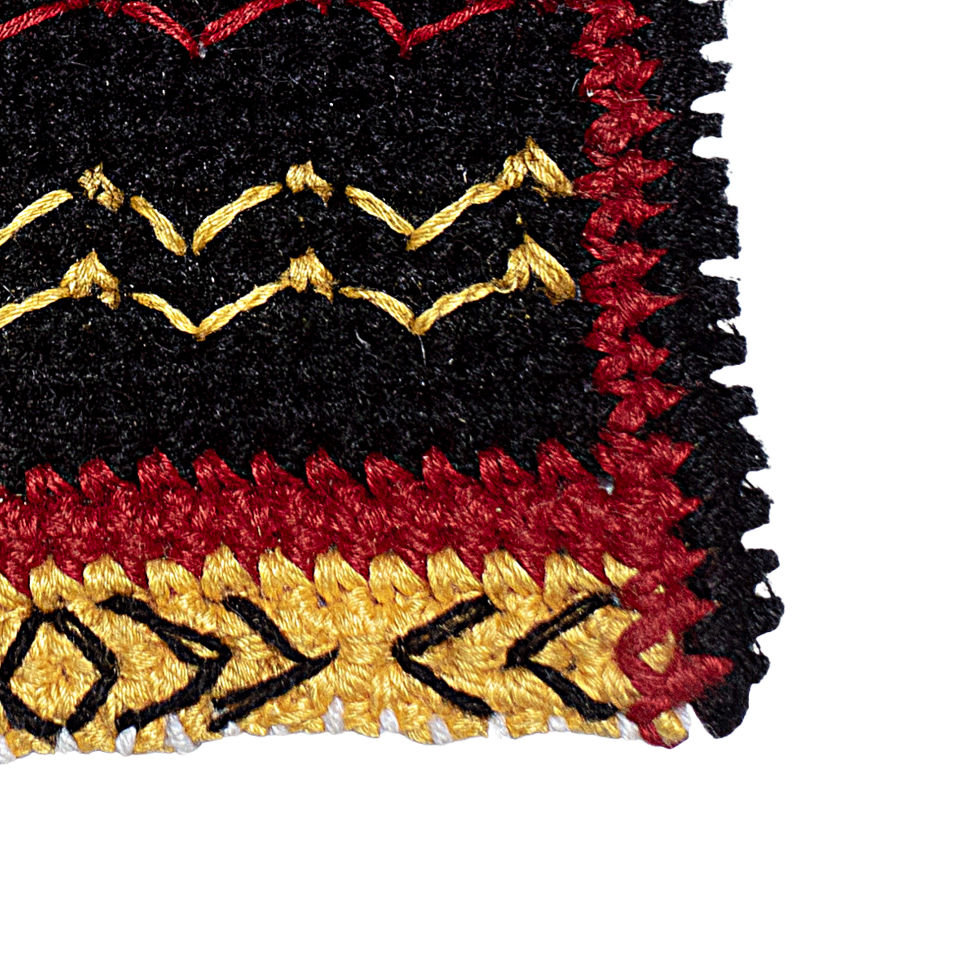 This piece zooms into a specific part of the warp and weft of patterns in the Kankana-ey male dress. There are two common geometric symbols featured: the "matmata" and the "tiktiko." The "tiktiko" are the zigzag lines that span across the piece, represent mountains, where the rice fields are. The diamond shapes that look like eyes are called "matmata," meant to signify both abundance and harmonious relations with the environment: they imply the constant presence of their ancestors with the eyes, and also stand for grains of rice and the way it nurtures the overall community.