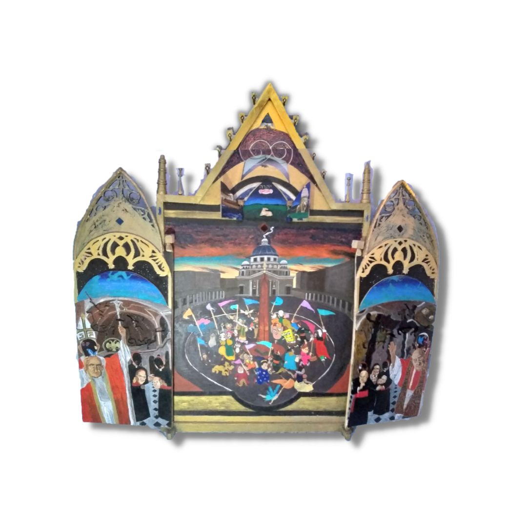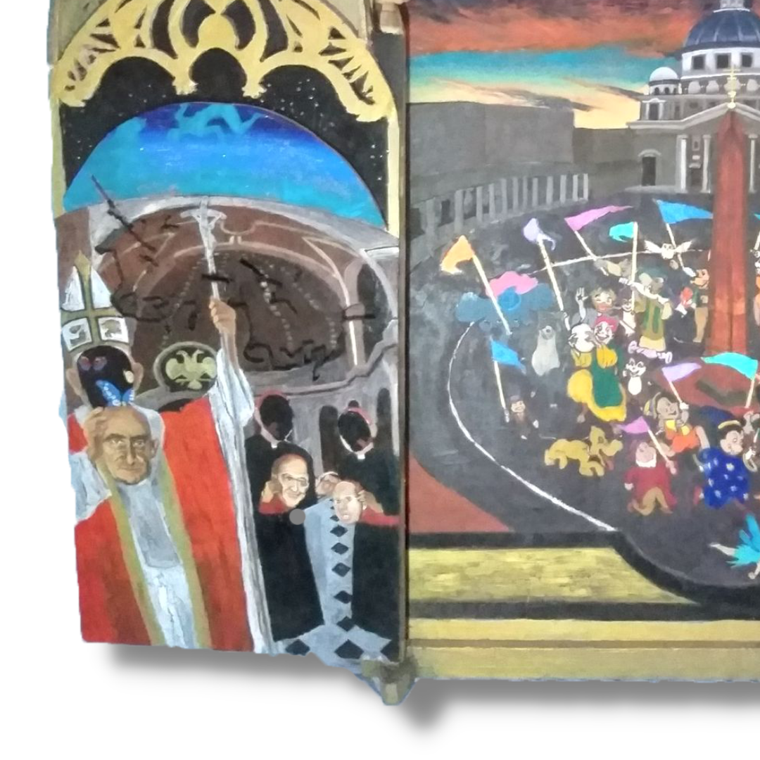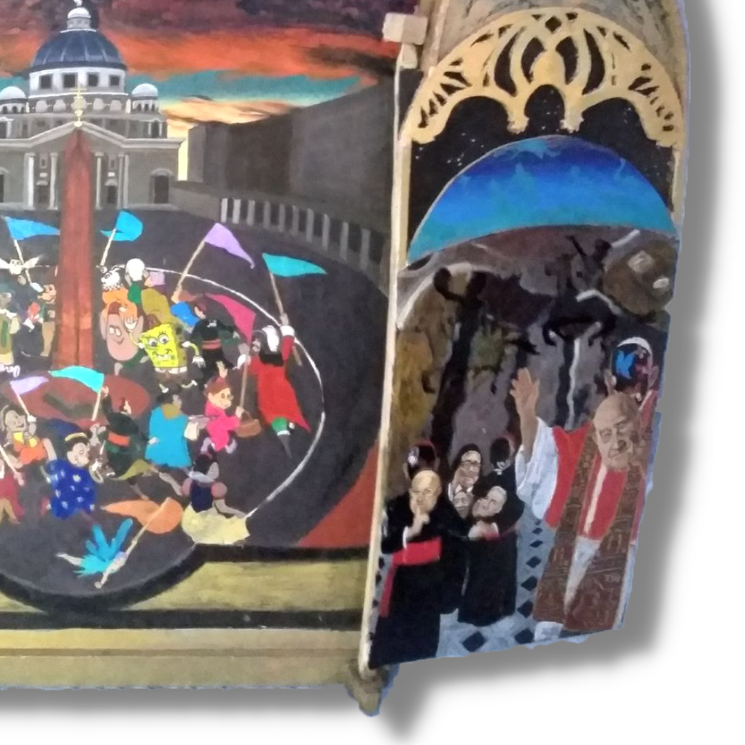 “My mixed media retablo is a direct exploration to the current crisis of faith that was prophesied by Our Lady of Fatima with regards to how Catholics would be deceived and infiltrated by unseen dark forces bent on contaminating the church from within by starting the apostasy that would begin at the top.”