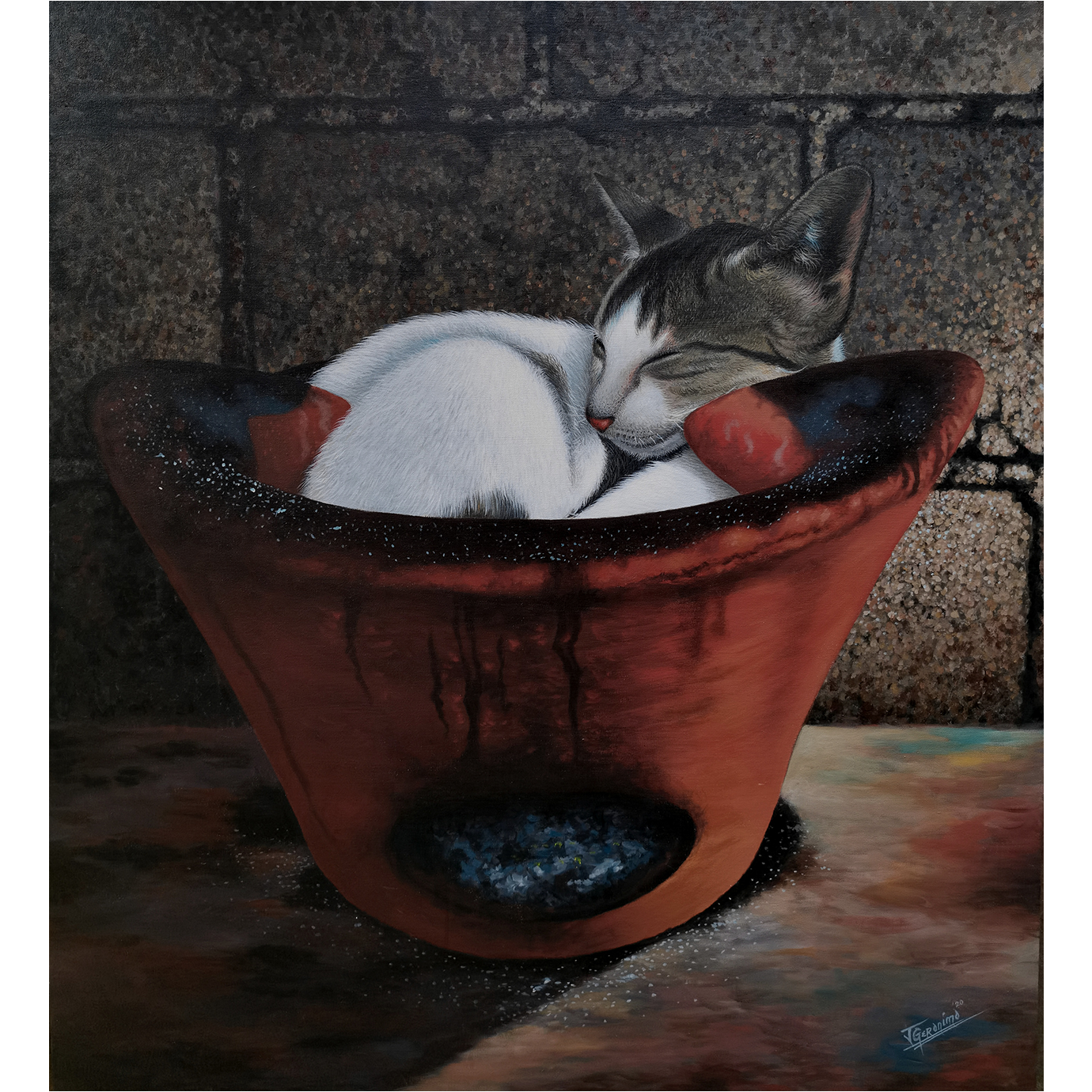 It is a painting of Cat that always rested and taking a nap inside the " kaang" after she eats her food.