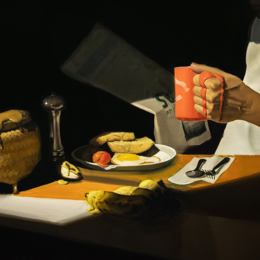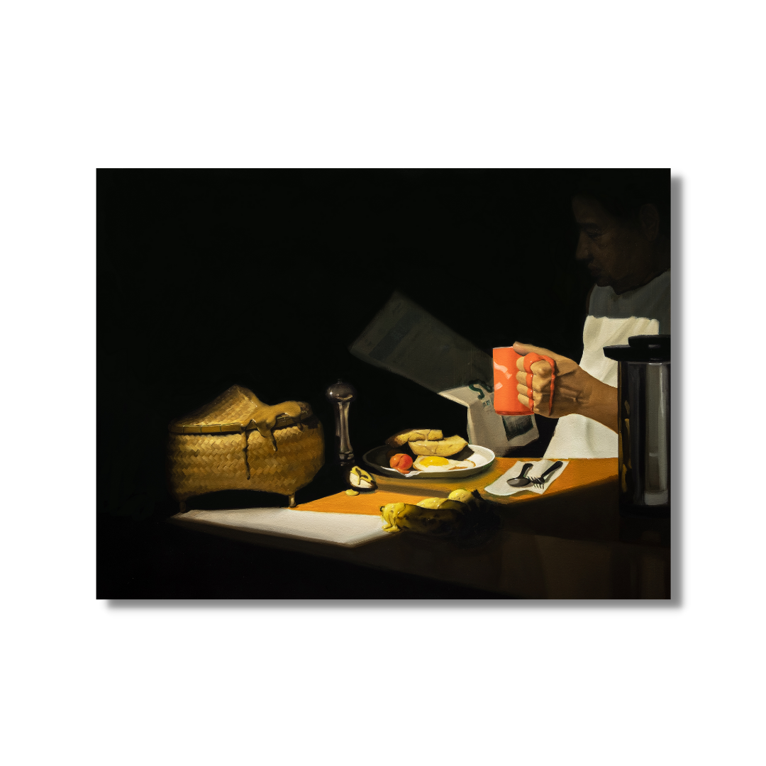 "This piece is one of my most personal works. It is of my father sitting in his usual spot where he eats his breakfast before heading out to work. He is reading the newspaper just as the 8am sun hits the window and lights up the scene. A view I see almost every day. A daily routine that I have watched through the years. But in my painting, everything around him is slowly disintegrating, as if they were made of wax and melting under the heat of the morning sun. This is to represent the passing of time. Almost all of the objects under the sunlight are in mid- decay, all except for my father. It's as if one can plead with time, to spare those that matter most."