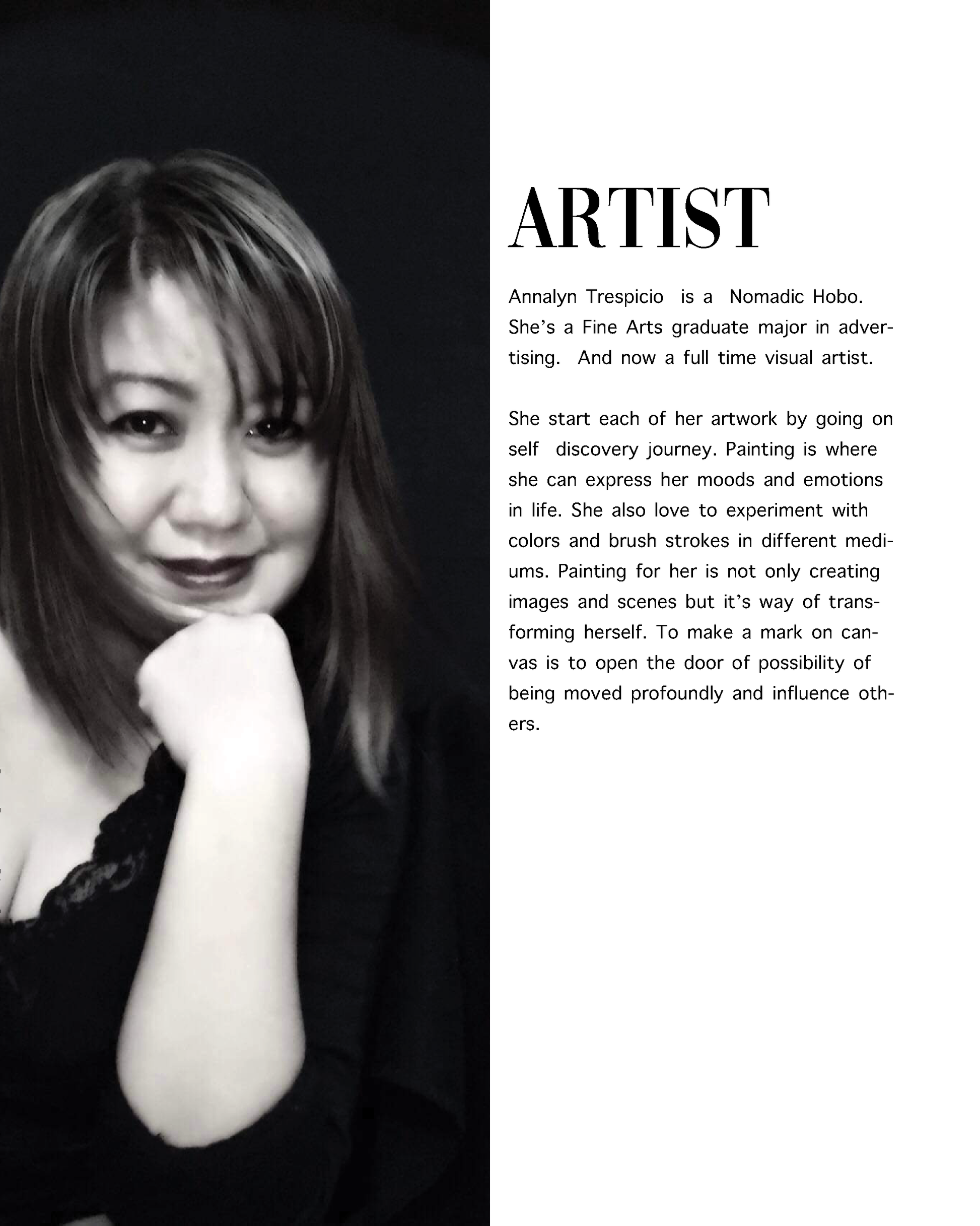Annalyn Trespicio is a Nomadic Hobo. She's a Fine Arts graduate major in advertising. And now a full time visual artist. She start each of her artwork by going on self discovery journey. Painting is where she can express her moods and emotions in life. She also love to experiment with colors and brush strokes in different mediums. Painting for her is not only creating images and scenes but it's way of transforming herself. To make a mark on canvas is to open the door of possibility of being moved profoundly and influence others.