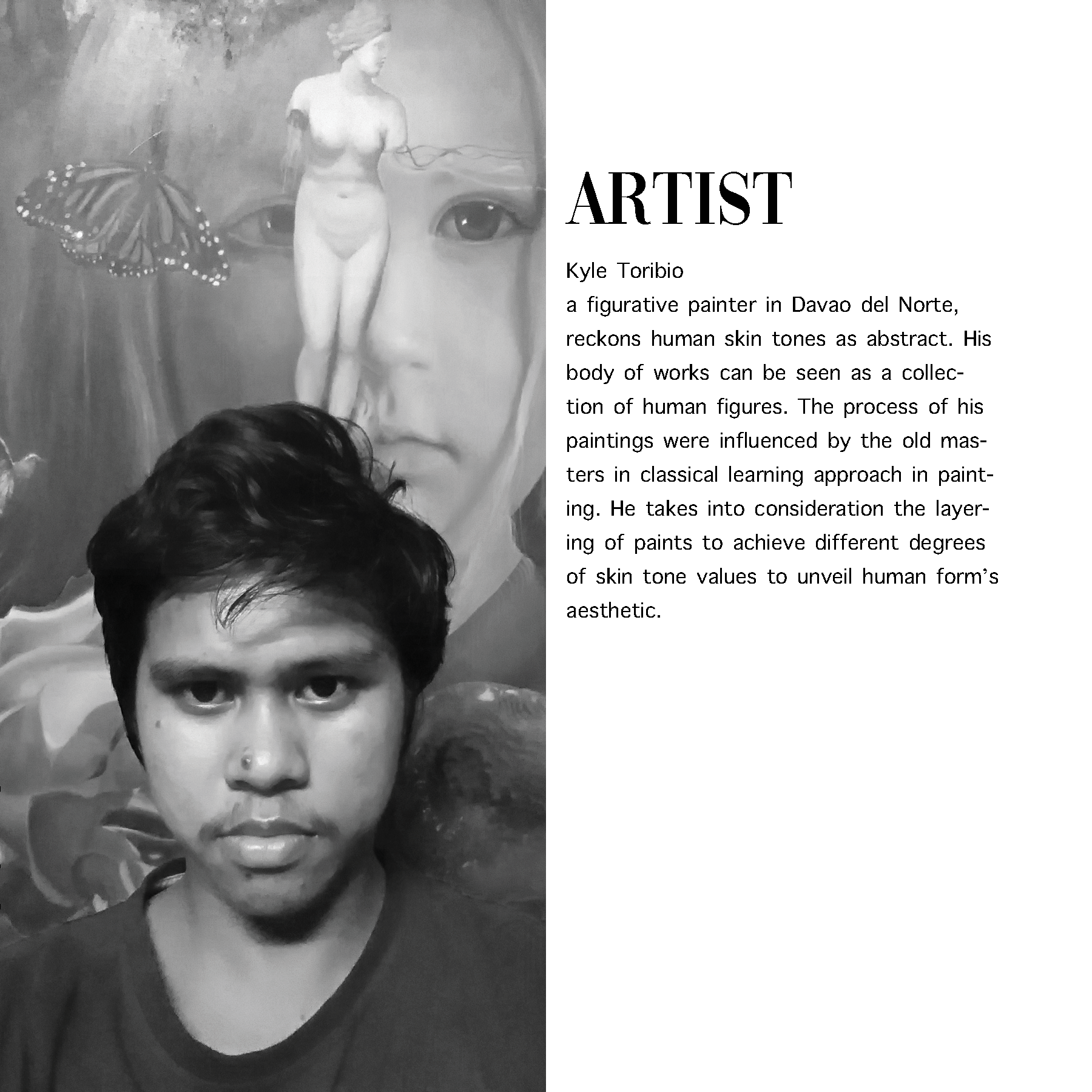 Kyle Toribio a self-taught figurative painter in Davao del Norte, reckons human skin tones as abstract. His body of works can be seen as a collection of human figures. The process of his paintings were influenced by the old masters in classical learning approach in painting. He takes into consideration the layering of paints to achieve different degrees of skin tone values to unveil human form's aesthetic.