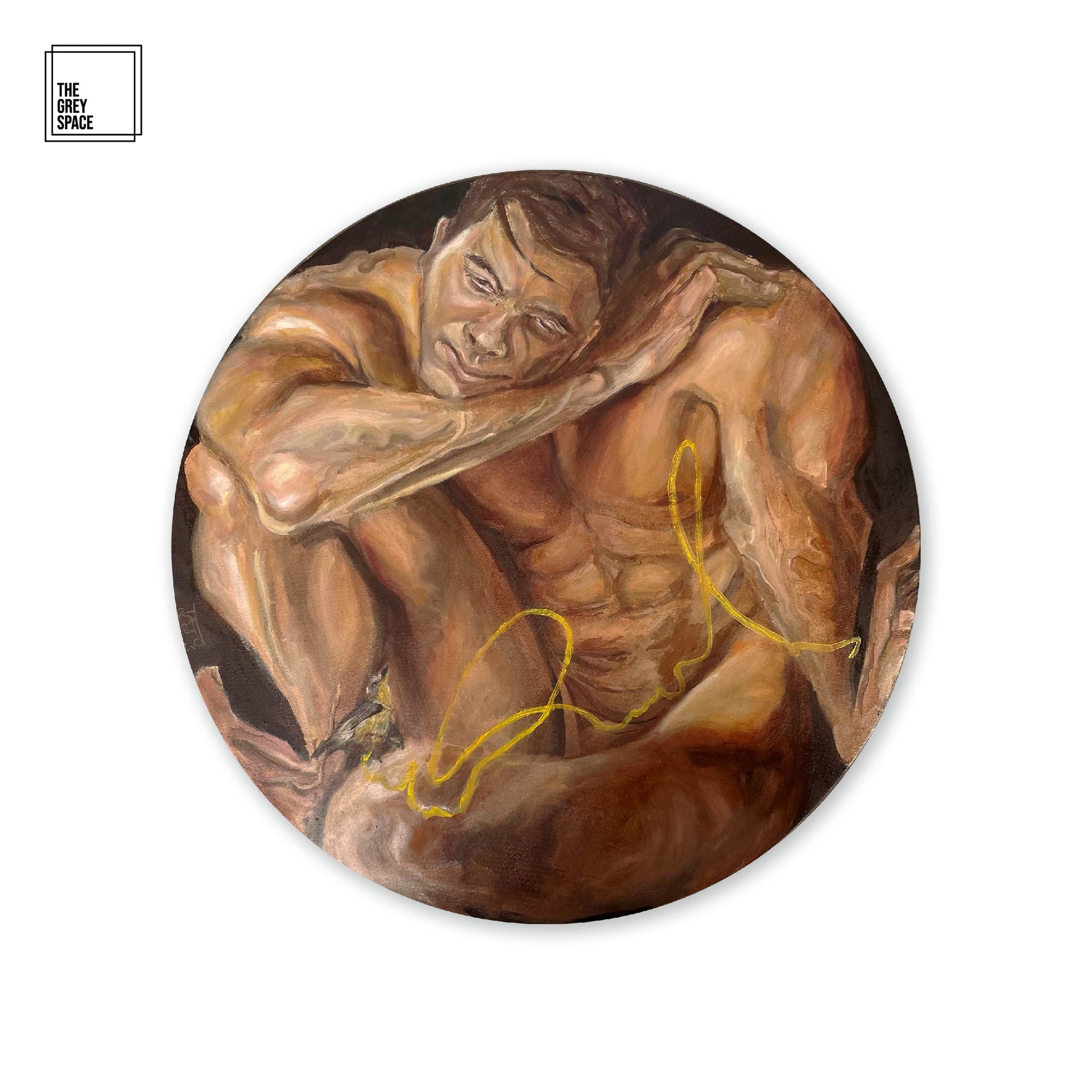 This piece exhibits the physical manifestation of the lengths at which we push our bodies to try to achieve godly ideals. The figure distorts in an attempt to fit in the circle. He stares at a bird, a Yellow Belly Fly Eater tethered to him by an imaginary string, whose call is often heard but is allusive to the eyes.
