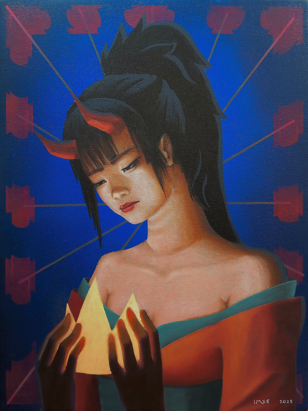 IMXE is a self-taught artist through mural projects and apprenticeships. Born 2002, based in San Juan City. Uses acrylics and spray paints to make high-contrast, colorful portraits.