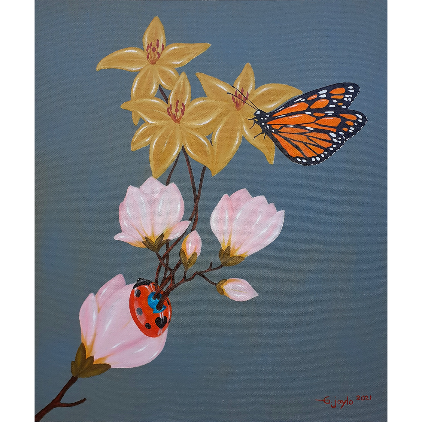 This piece deals in the series of life of and flowers and how pollinators reproduce them. The life of everyone depends in every organism around us. This piece indicates that everyone around us is important to maintain the cycle of life.