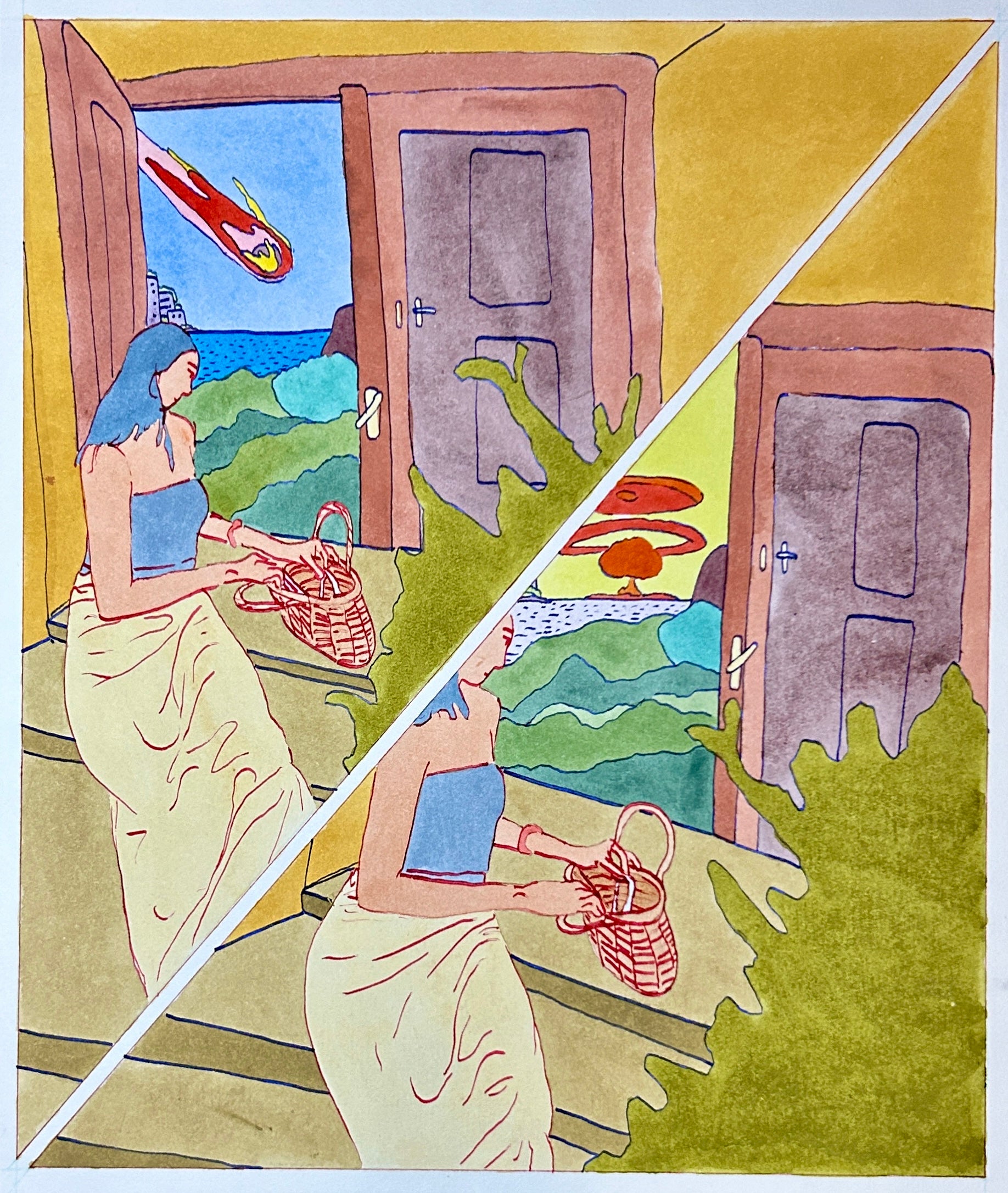 A meteor is hurtling toward earth. Destruction is inevitable but we go on with our daily lives, with or without the meteor.