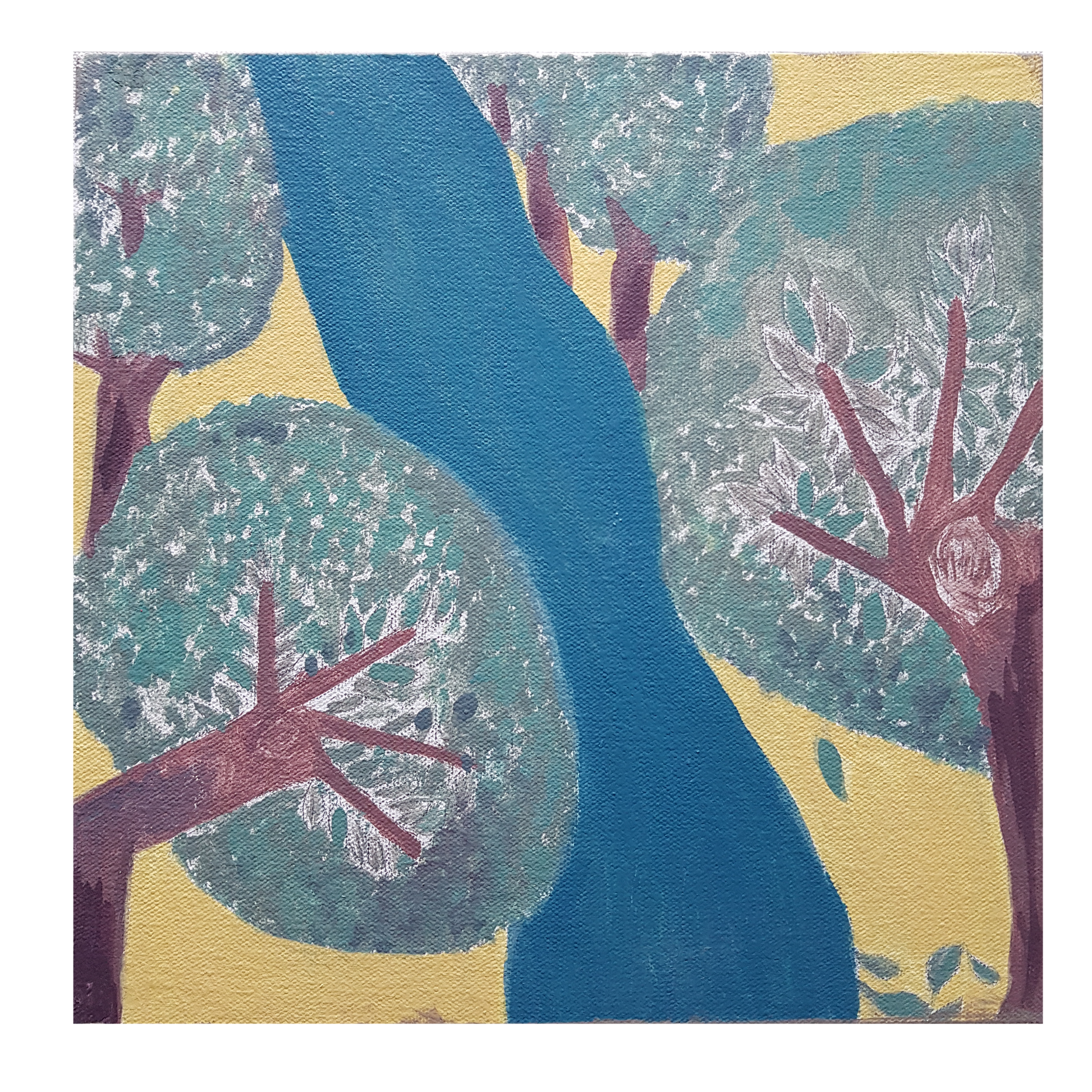 A painting of the clear blue river running past lush trees - these aren’t things you see often in the city..