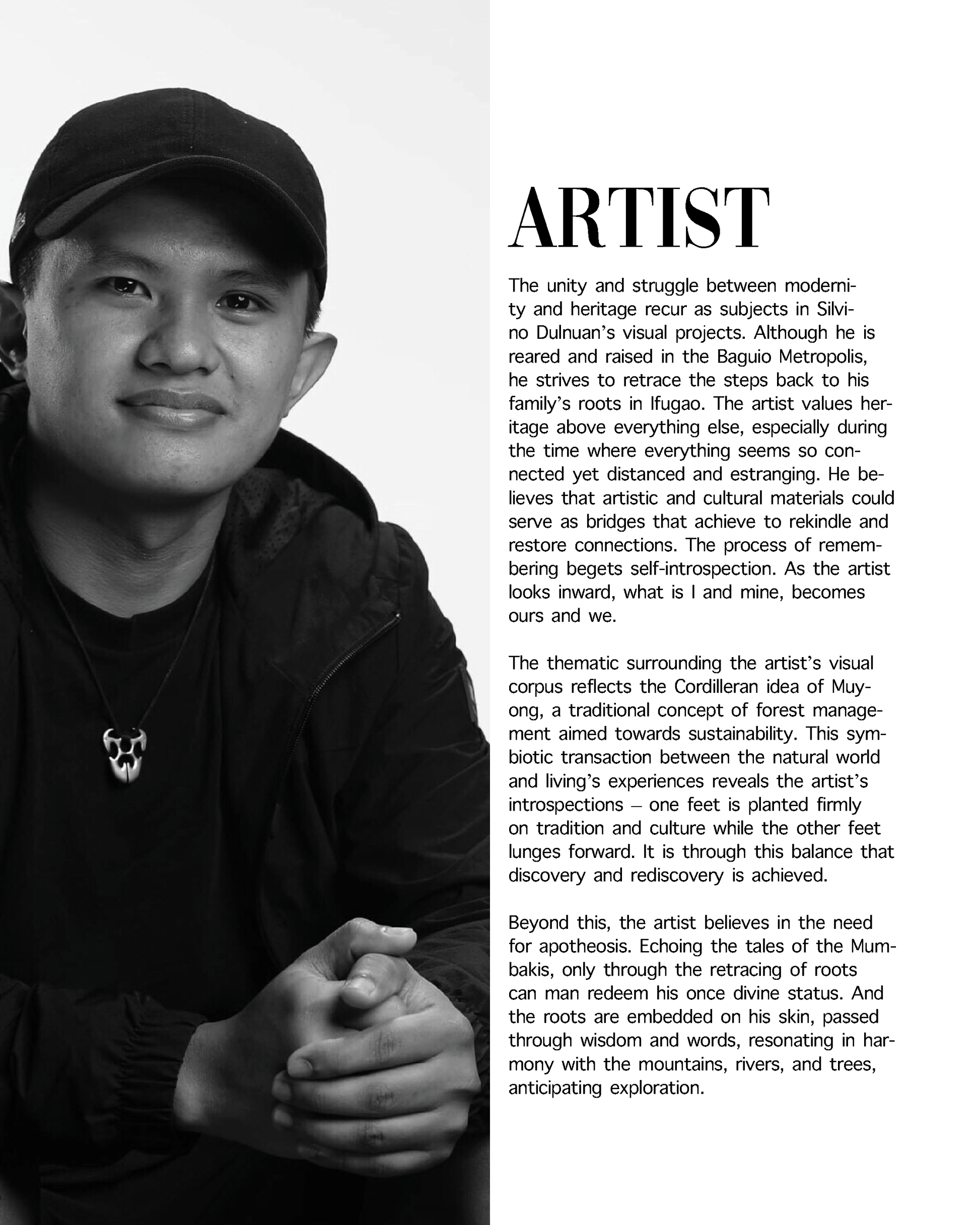 The unity and struggle between modernity and heritage recur as subjects in Silvino Dulnuan’s visual projects. Although he is reared and raised in the Baguio Metropolis, he strives to retrace the steps back to his family’s roots in Ifugao. The artist values heritage above everything else, especially during the time where everything seems so connected yet distanced and estranging. He believes that artistic and cultural materials could serve as bridges that achieve to rekindle and restore connections. The process of remembering begets self-introspection. As the artist looks inward, what is I and mine, becomes ours and we. The thematic surrounding the artist’s visual corpus reflects the Cordilleran idea of Muyong, a traditional concept of forest management aimed towards sustainability. This symbiotic transaction between the natural world and living’s experiences reveals the artist’s introspections – one feet is planted firmly on tradition and culture while the other feet lunges forward. It is through this balance that discovery and rediscovery is achieved. Beyond this, the artist believes in the need for apotheosis. Echoing the tales of the Mumbakis, only through the retracing of roots can man redeem his once divine status. And the roots are embedded on his skin, passed through wisdom and words, resonating in harmony with the mountains, rivers, and trees, anticipating exploration.