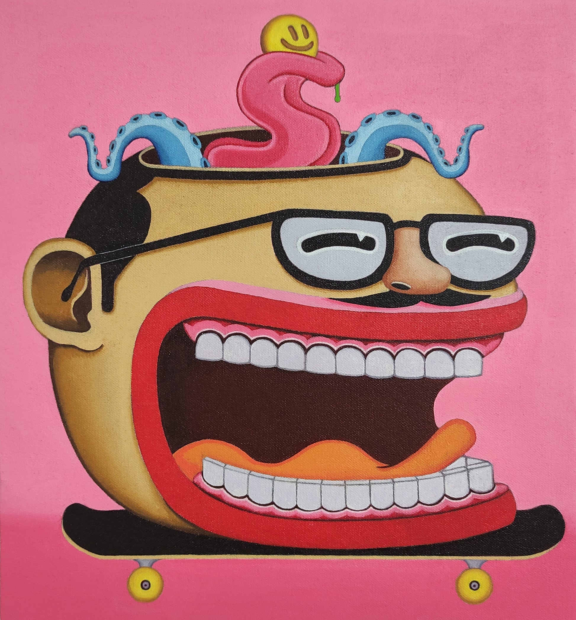 BigMouth is a self-taught visual artist from the Philippines known for his big-headed teeth denture stapled eyes character. His interest in contemporary art and music channels painting on streets and canvas, a way form of expressing his thoughts, ideas and influences such as graffiti, skateboarding and punk rock. Making art form mediums of oil paint, acrylic and spray cans on surfaces, toys, stickers and wheatpaste art, adbusting billboards signs, coloring canvas and walls with brightly colored skittled characters and creatures from his childhood imagery and everyday experiences.