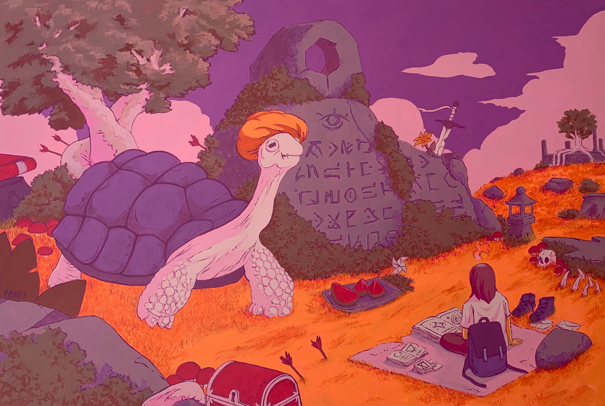 Among the overgrown relics of a forgotten field, a lone student studies beneath the gaze of an ancient creature—part relic, part mentor. Time moves differently in the company of this being, whose breath echoes the rhythm of stones and seasons. The etched monolith behind them hums with the languages of those who remembered before us.
