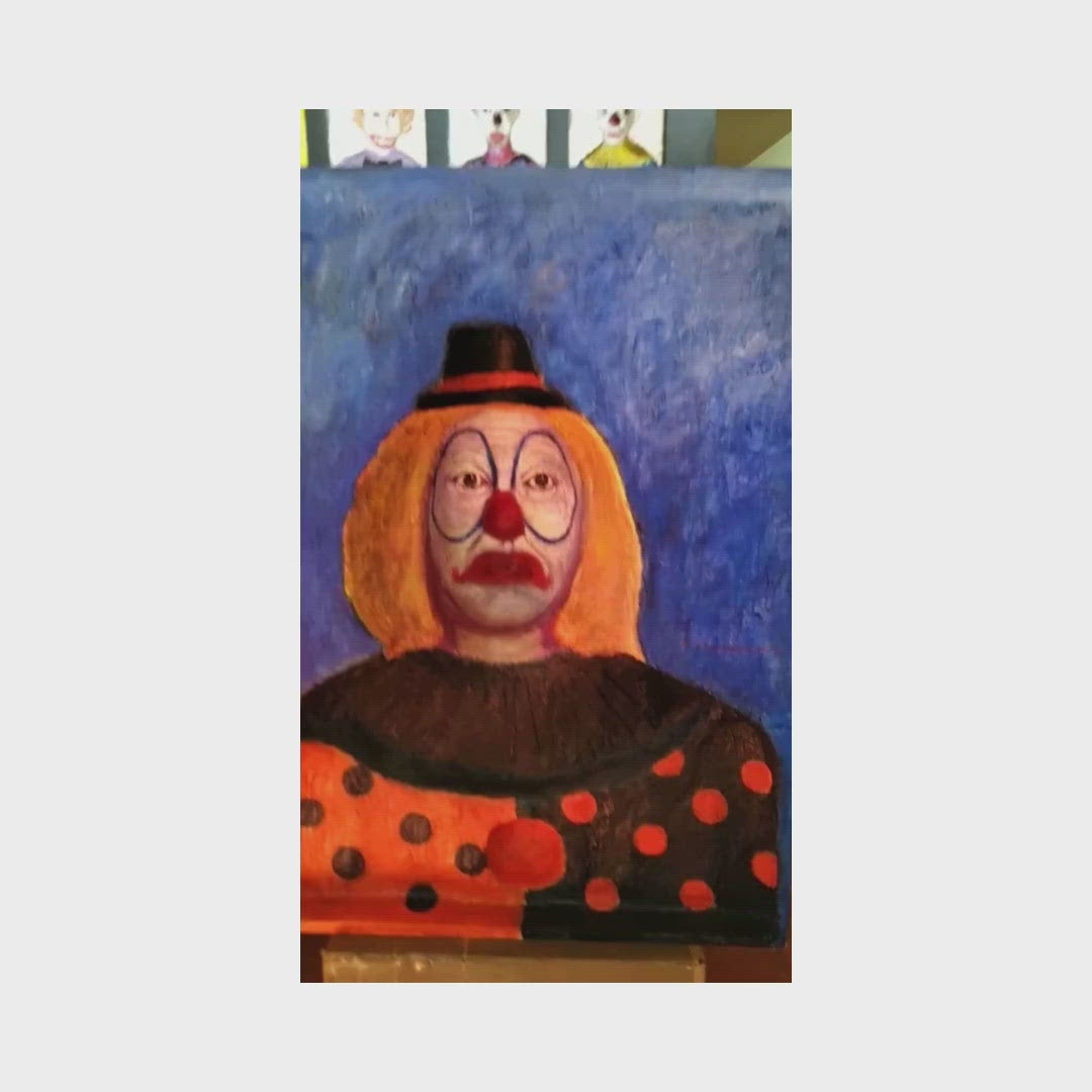 “ The artwork is mounted on a box. This is a portrait of a clown, a kinetic art piece. The artwork appears to be moving sideways, vertical or even diagonal when the viewer moves, this is because of the illusion created.”